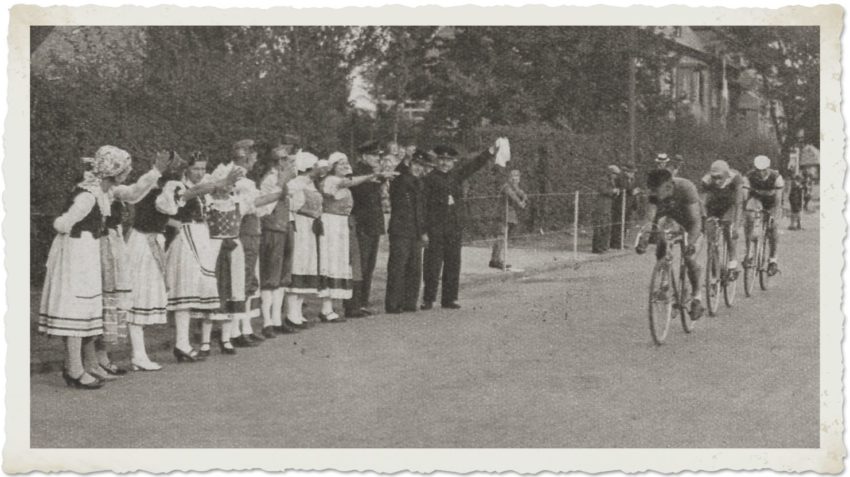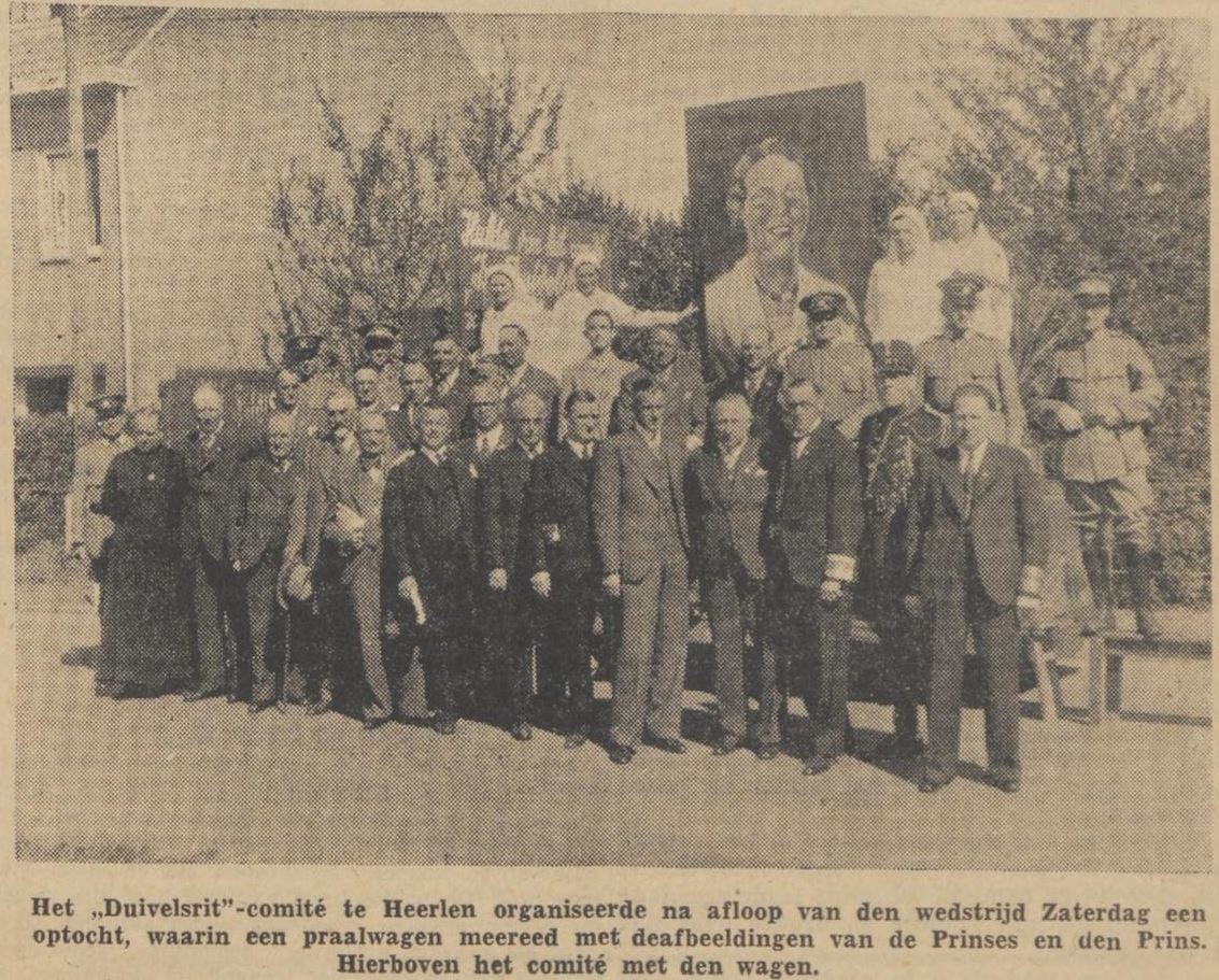 Maar ook onze Schutterij was aanwezig en de Harmonie St. Caecilia en het Trommel- en Pijpercorps „Vrei Weck” en de mannen en vrouwen van ’t Rode Kruis en daartussen in waren auto’s met de Burgemeester en de organisatoren en de besturen van Oranje-comité en V.V.V. en het Rode Kruis. En daarbij als hoofdmoment de winnaars van de ronde, en dat alles is onder muziek en gejubel door Heerlen getrokken, door de Vlotstraat en Akerstraat, langs Emmastraat, Wilhelminaplein, Stationstraat, Saroleastraat en Bongerd naar het Grand Hotel.