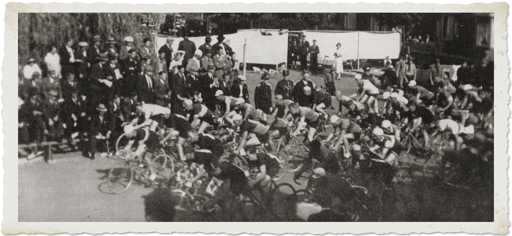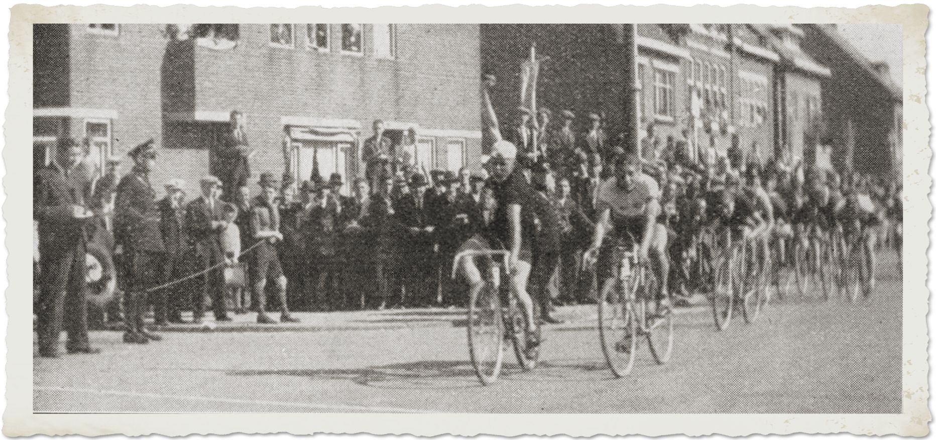 Een stuk of vijftig renners kromden hun ruggen en stonden op hun pedalen om zoo snel mogelijk vaart te krijgen en toen waren ze weg ook. En dat is in het kort te wijze, waarop de eerste wegwedstrijd in Heerlen een aanvang heeft genomen. Dat wil dus zeggen, dat dit relaas daarover niet meer of minder dan een historisch document is. Als in 2035 de honderdste Duivelsrit met grote feestelijkheden zal worden begonnen, zal op de feestelijke tentoonstelling, welke dan gehouden wordt, een vergeeld exemplaar van dit blad aanwezig zijn, om de mensen te laten lezen, hoe de eerste keer het startschot gevallen is. Welnu, dan dient ook bekend te zijn, dat het startschot voor de profs, afgevuurd werd door den Burgemeester van Heerlen, dhr. van Grunsven, die het wapen een ietsje gemakkelijker hanteerde en die daarmee toch maar dat resultaat had het kan niet ontkend worden dat een dikke zeventig dappere kerels haastig wegvluchtten.