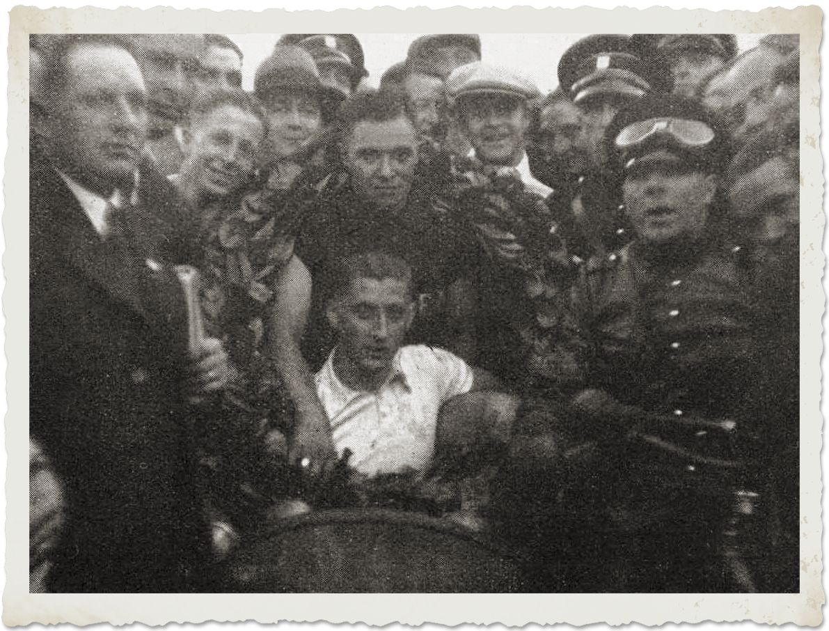 De jubel, waarin Pijnenburg viel, toen hij zich het eerst over den eindstreep had geperst, hield nogal even aan. Daar moest natuurlijk eerst een ereronde worden gemaakt, hetgeen geen kleinigheid was bij die enthousiaste naderbij golvende menigte, maar gelukkig was er de politie, die voor deze gelegenheid in haar nieuwe uniform was uitgedost en deswege nog meer dan anders een kranige aanblik opleverde.
