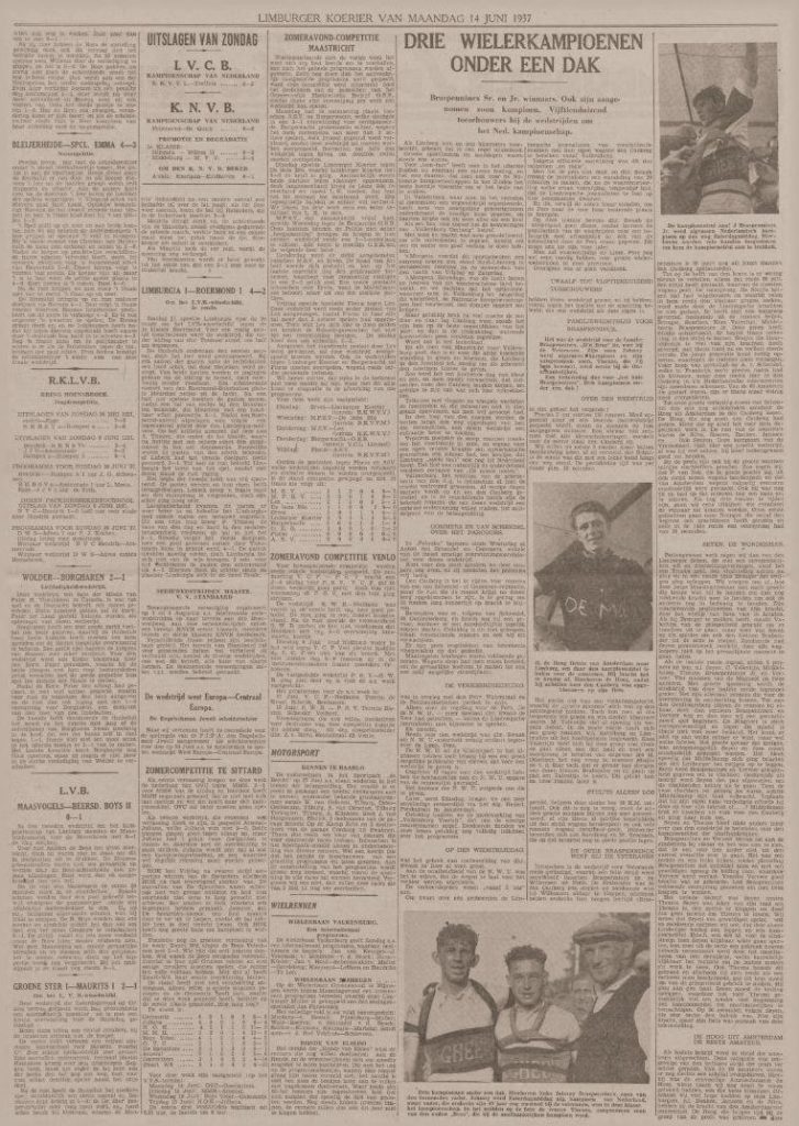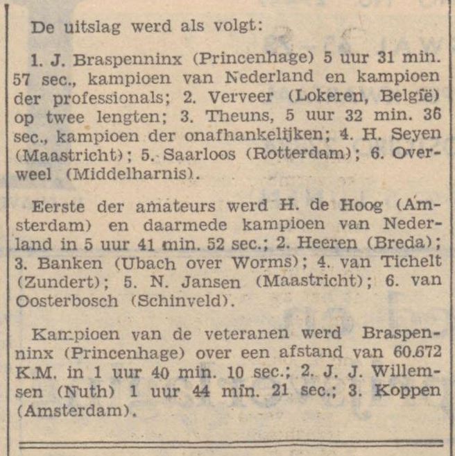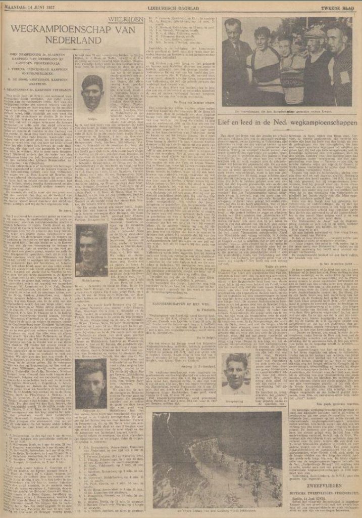 Verslag van de wedstrijd voor beroepsrenners, onafhankelijken en amateurs: Om 2 uur werd aan 150 deelnemers het startschot gegeven. Het weer was tamelijk warm en er stond een lichte wind waarvan de renners geen hinder hadden. De eerste ronde wordt een beetje terrein verkend. Gerrit v. d. Ruit en de Korver komen met 150 meter voorsprong door, in 3e positie Gijsen en dan volgt de groep. In de 2e ronde gaat C. Valentijn die bij de beklimming van de Cauberg het snelst is, op kop met de Korver, Stuyts en v. d. Ruit. De voorsprong van dit groepje is 300 meter op het peloton. Marinus Valentijn heeft pech met zijn versnellingsapparaat en moet opgeven. Verschillende opgaven vielen reeds aan te stippen als van Clignet, Reynen, Louis van Schijndel, Reuter, Hellemons, v. d. Broek e.a. Overige vermeldenswaardige gebeurtenissen doen zich de volgende ronden niet voor. Het peloton wordt in stukken uiteengerukt. Als we met de volgauto tegen het einde van de 7e ronde langs de renners rijden zijn Bronger en C. Valentijn weg met Overweel en v. d. Baan aan hun wiel. Stuyts heeft 45 sec. achterstand op deze leiders. C. Valentijn weg. Een renner in vorm weet dikwijls zelf niet waartoe hij in staat is. Dat zien we de volgende ronde als we met onze volgauto langs de renners suizen. We rijden eerst het grote peloton voorbij, waarin we zien van Amsterdam, v. d. Ruit, Gageldonk, van Tichelt, Vaessen, de Hoog, Lambrichs e.a. Piet Gommans, de landskampioen 1936 demarreert om op een groep voor hem te geraken, waarbij we o.a. zien Gijsen, Stuyts, v. d. Star, v. d. Baan, Verveer, en Saarloos. We passeren dan Bronger en Overweel en moeten dan ver rijden Kees Valentijn zit zeker met 2 min. voorsprong op de grote groep. Kees vertelde ons na afloop dat hij van mening was dat de overige renners gevallen waren want hij was nog niet eens van plan geweest om zó hard weg te komen! Kees Valentijn rijdt dan in prachtig tempo gedurende 20 km alleen op kop maar Bronger en Overweel lopen op hem in en als de ketting van Valentijn afloopt gaan zij hem even voorbij. Kees heeft echter rap hersteld en krijgt terug aansluiting. Bij de tiende beklimming van de Cauberg neemt Stuyts een voorsprong. Alleen v. d Star kan hem volgen, en met een achterstand van ongeveer 5 sec. komt hij als tweede op de top aan. Bronger, Overweel, Gijzen, J. v. d. Baan en Valentijn jr., volgen op een halve minuut. Daarachter komt een peloton van 17 renners, dat 1 min. 25 sec. achter ligt en waarin we o.a. opmerken, J. Braspennincx, H. Sijen, Motké, Peek, H. de Hoog (de eerste amateur), J. Verveer, Middelkamp, A. van Schendel, A. Vaessen, Hopstaken. Het grote peloton, dat hierna kwam en zeker een achterstand had van ongeveer 2 minuten werd aangevoerd door G. v. d. Ruit. Aan te stippen valt dat de Roosendaalsche amateur Hopstaken die nog in fraaie positie zat door pech moest opgeven. In het geheel waren nog slechts een goede 40 renners in koers. Prachtig werk van Bronger. Stuyts wordt al spoedig nagezet door Bronger. De Roosendaler nadere steeds meer op Stuyts die hij weet te bereiken. Met kracht demarreert Bronger over Stuyts heen die moet lossen en achter geraakt. Bronger vindt het nog wat te vroeg en laat zich inlopen door Verveer, Overweel, C. Valentijn en Saarloos. Verveer was dus prachtig bijgekomen. Middelkamp, Sijen, Braspennincx en Theuns trokken er ook tussenuit om zich bij de kop te voegen. Maar nu gaat Bronger plotseling weg en toont zijn capaciteiten. Na in de eerste ronde ongeveer 2 minuten te hebben achter gestaan, na al het werk, dat hij heeft moeten verzetten om deze achterstand in te lopen, na de bergen, die hij heeft moeten verzetten om bij te komen, na kilometers lang achter Stuyts aangejaagd te hebben, gaat hij…. rustig lopen. Met elke kilometer groeit zijn voorsprong en bij het begin van de 14e ronde heeft hij reeds 48 seconden veroverd op een groep van 8 achtervolgers: Overweel, J. Braspenninx, C. Valentijn, H. Sijen, J. Theuns, Middelkamp en J. Saarloos. Stuyts ligt op ongeveer 1,5 minuut, terwijl A. van Schendel is teruggevallen tot op ongeveer 2 minuten met H. de Hoog (1e amateur) en A. Maas aan zijn wiel. Telkens als Bronger de Cauberg opgaat wint hij veld. Zijn voorsprong groeit tot 54 sec. Maar dan gaat C. Valentijn in de achtervolgende groep aan het sleuren. In de 17e ronde liep Kees Valentijn Bronger in, die zich tactisch liet terugvallen met de bedoeling tegen het einde opnieuw voorsprong te nemen. C. Valentijn liep intussen 20 sec. uit, maar werd toen ook ingelopen. De strijd zou gestreden worden tussen Bronger, Verveer, Sijen, Theuns, Valentijn en Braspennincx met Bronger en C. Valentijn als de grote favorieten. Maar toen kwam voor Bronger bandbreuk terwijl 7 km voor het einde C. Valentijn wegens kettingpech de strijd moest staken. Kees Valentijn kreeg dit ongeval toen hij nog juist voorsprong had genomen…. De eindsprint is gereden tussen Johny Braspennincx en Verveer. Met 3 lengten voorsprong won Johny Braspenninx. Theuns en Sijen volgden op de derde en vierde plaats, aangezien Middelkamp, toen hij in de gaten kreeg dat er voor hem niets meer te verdienen viel dan een medaille, de strijd staakte. Theuns werd kampioen van de onafhankelijken en de Hoog (Amsterdam), die met 10 min. achterstand aankwam, werd amateur-kampioen. Een keurige prestatie van deze 17-jarige jongen. Dit kereltje was vrijdag even per fiets naar Valkenburg gekomen en had zonder verzorging de strijd aangepakt. De uitslagen bij de veteranen werd de oude Braspennincx kampioen, en met Theuns die bij Braspennincx inwoont, kreeg Princenhage dus drie kampioenen ineens.