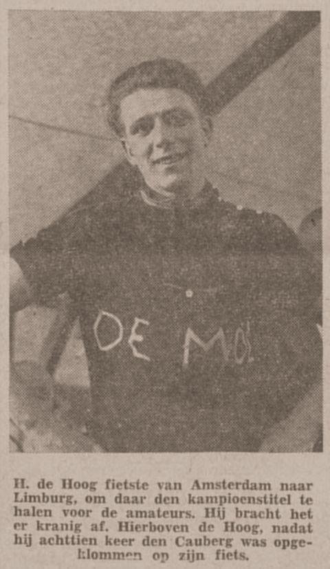 Je bent wegrenner, of je bent het niet, je bent klimmer of je bent het niet. Deze stelling is de laatste wedstrijd, nu de wedstrijden op de weg meer en meer in de belangstelling van de grote massa komen te staan meermalen ontwikkeld en aan de hand van den uitslag moet men zeggen dat daarvan veel van aan is. Als eerste bij de amateurs kwam over de finish gestoven een echte, ronde Amsterdamse jongen, n.l. Henk De Hoog, die in zijn hele leven nog niet zo’n berg van het formaat als de Cauberg had gezien maar hij die het toch klaar gespeeld heeft deze col achttien maal te nemen en evenveel malen de bochtige en gevaarlijke Geulhemerberg af te dalen. Een jongen uit het hartje van Holland, uit het vlakke land, won daar. Een geboren wegrenner? Ja, liet moet wel zo zijn. En in zijn sas dat ie met zijn overwinning was, temeer begrijpelijk als men weet, dat hij de laatste 30 km op eigen kracht was aangewezen en dat hij het gedurende de gehele wedstrijd zonder verzorger heeft moeten stellen. Is het niet bewonderenswaardig? — Dames en heren, zo sprak ie voor de microfoon, nadat Swaab de Beer ook hem met de gebruikelijke woorden had gehuldigd, ik ben erg gelukkig, dat ik gewonnen heb, ik ben pas zeventien jaren en in augustus wordt ik achttien. Meer weet ik niet..