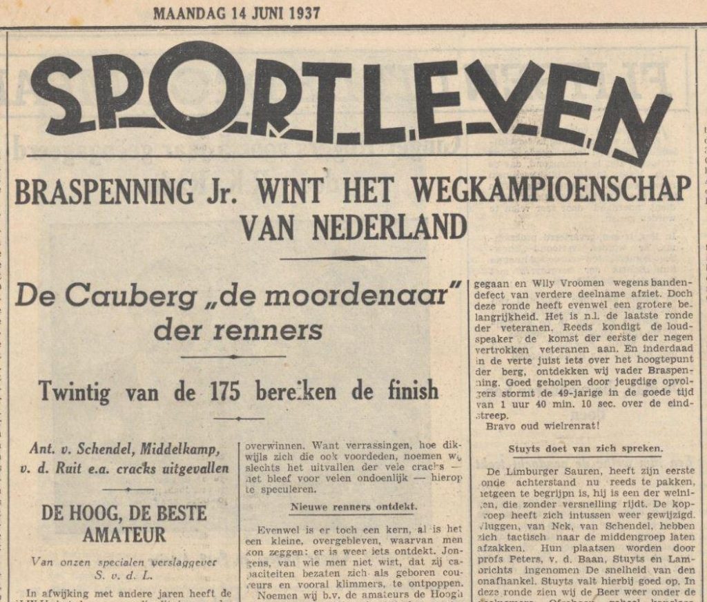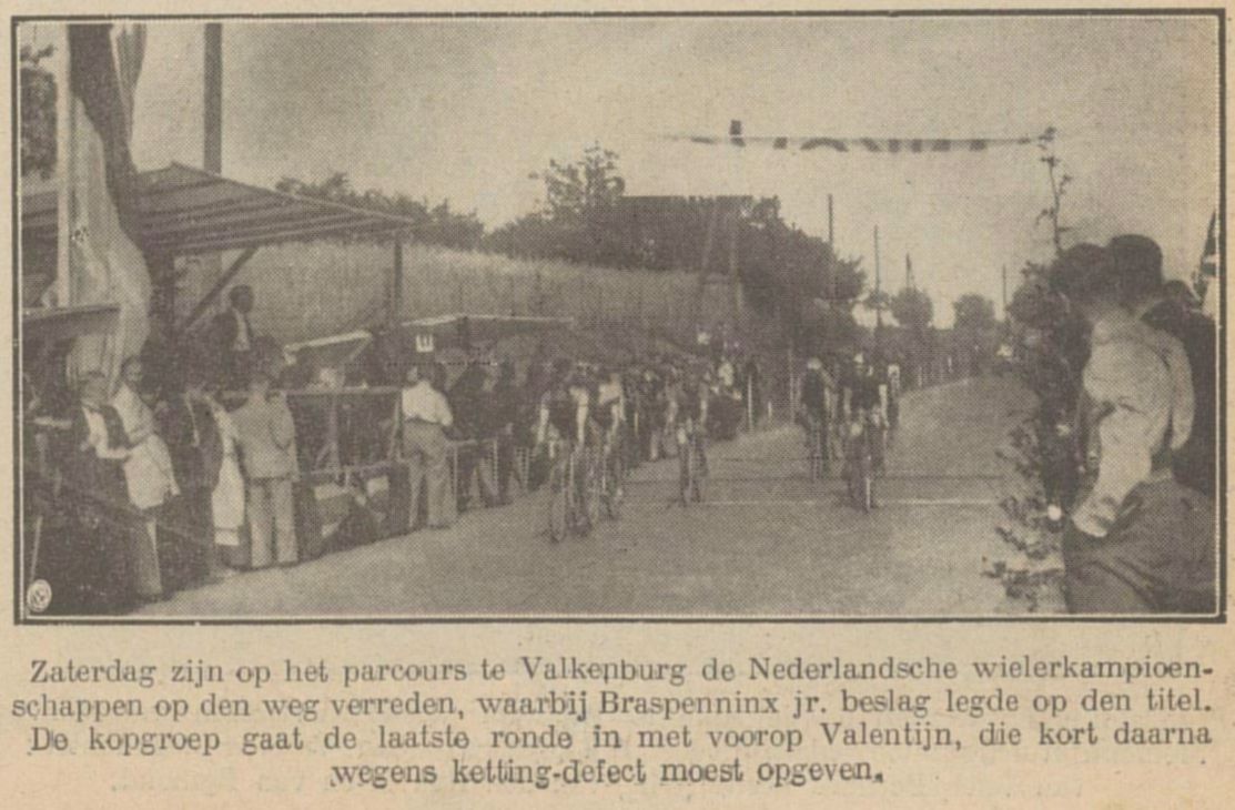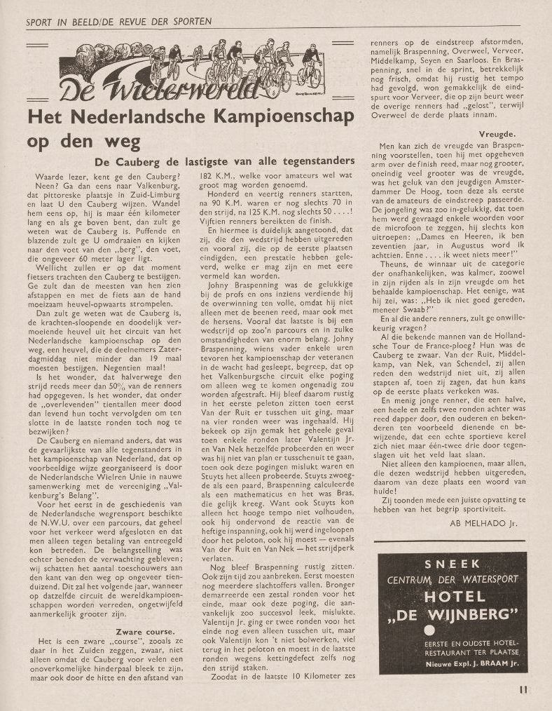 Bij de nationale weg-kampioenschappen van Nederland welke Zaterdag 13 juni te Valkenburg zijn verreden is wel duidelijk bewezen dat het Valkenburgse circuit voldoet aan de hoogste eisen welke aan een omloop voor het wereldkampioenschap kunnen worden gesteld. Sterke hellingen en dalingen, men denke aan de steile Cauberg en de niet minder steile Geulhemerberg. De eerste moest op en de tweede afgereden worden en wel achttien maal hebben ze het allerbeste van de renners gevraagd. Alleen voor de geboren wegrenners waren in deze wedstrijd de titels te verdienen. De landstitel kwam tenslotte terecht bij John Braspennincx die, nadat eenmaal Cees Bronger en Kees Valentijn ongelukkigerwijze uit de koers waren verdwenen de meeste aanspraak op de titel mocht maken. Bronger en Kees Valentijn, dat waren op het Valkenburgse circuit zonder overdrijving de besten van de wedstrijd. Die twee gingen de steile 1200 meter lange Cauberg op met zulk een gemak als reden ze op de vlakke weg. Dat Bronger in het begin van fiets moest veranderen en Valentijn te half-koers zijn ketting afliep was voor geen van beiden bezwaar om dadelijk al hun tegenstanders weer voorbij te snellen en zonder zichtbare inspanning weer aan de kop post te vatten. Wreed is echter dikwijls de teleurstelling voor de wegrenner. Toen van de 185 km, die te rijden waren reeds 175 km waren afgelegd trof tegenslag zowel Bronger als Valentijn opnieuw en werden beiden uitgeschakeld: Bronger door bandbreuk, de jonge Valentijn door kettingdefect.