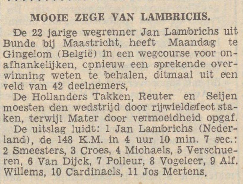In het begin van dit jaar heeft Lambrichs ons nog één en ander van zijn korte, maar zeker briljante wielerloopbaan verteld. Aan 46 wegcourses nam Jan in 1938 deel, met een totaal van 7.295 km. Zes wedstrijden wist hij daarvan te winnen, o. m. in Brussel—Fléron over 170 km., waarin hij direct vanaf het startschot in z’n eentje wegliep en, terwijl er toch 54 puike renners van de partij waren, met ruim vier minuten voorsprong arriveerde.