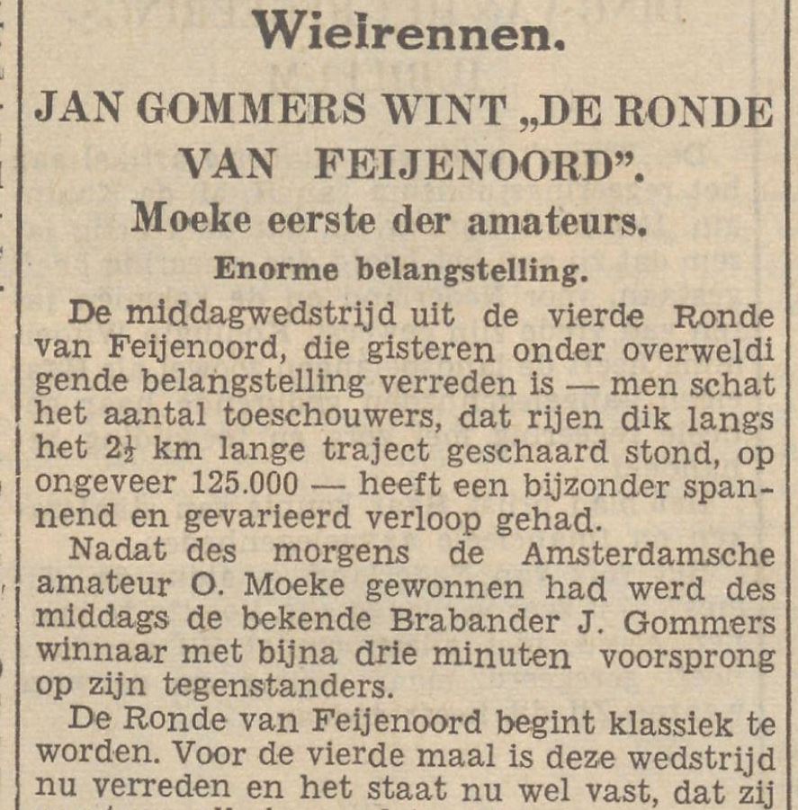Onder enorme belangstelling van het publiek, er waren in den ochtend reeds voor de amateurs naar officiële schatting ruim 100.000 toeschouwers, werd gisteren de vierde ronde van Feijenoord verreden.