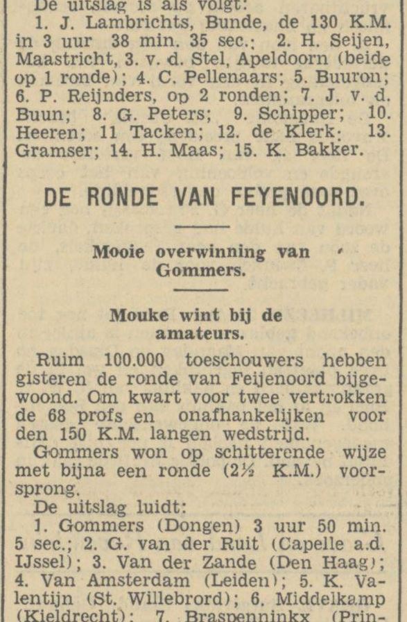 En in die groep zaten Alfons Stuyts en Middelkamp, maar Gommers had nu reeds een voorsprong van enige minuten genomen en kwam onbedreigd als eerste over de streep.