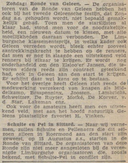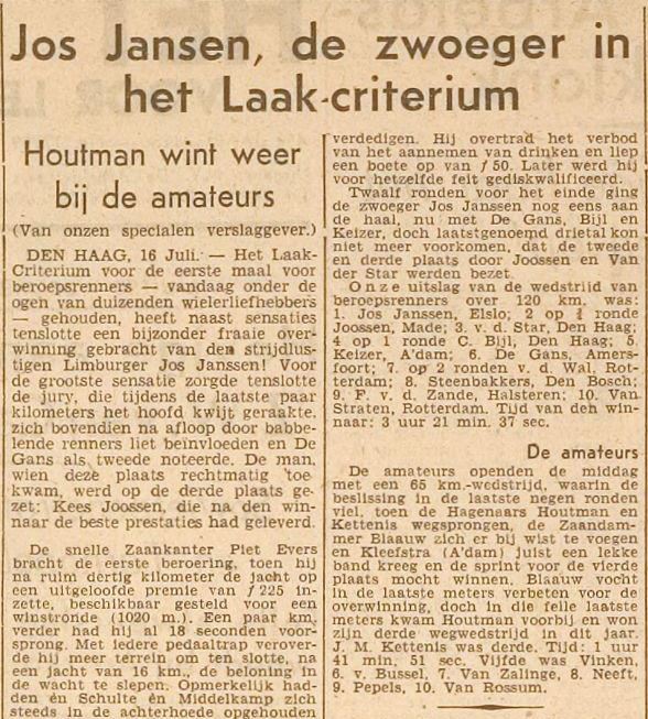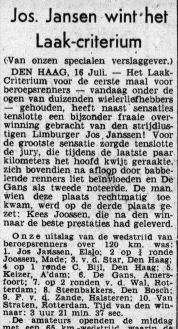 Het Laak- Criterium voor de eerste maal voor beroepsrenners onder de ogen van duizenden wielerliefhebbers gehouden, heeft naast sensaties tenslotte een bijzonder fraaie overwinning, gebracht van den strijdlustige Limburger Jos (Sjefke) Janssen!