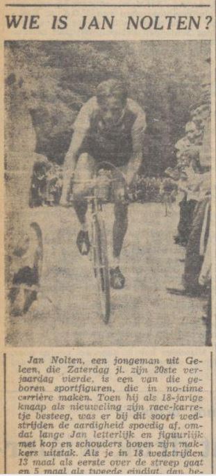 Jan Nolten, een jongeman uit Geleen, die Zaterdag jongstleden zijn 20ste verjaardag vierde, is een van die geboren sportfiguren, die in no-time carrière maken. Toen hij als 18-jarige knaap als nieuweling zijn race-karretje besteeg, was er bij dit soort wedstrijden de aardigheid spoedig af, omdat lange Jan letterlijk en figuurlijk met kop en schouders boven zijn makkers uitstak.