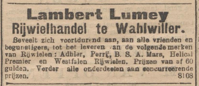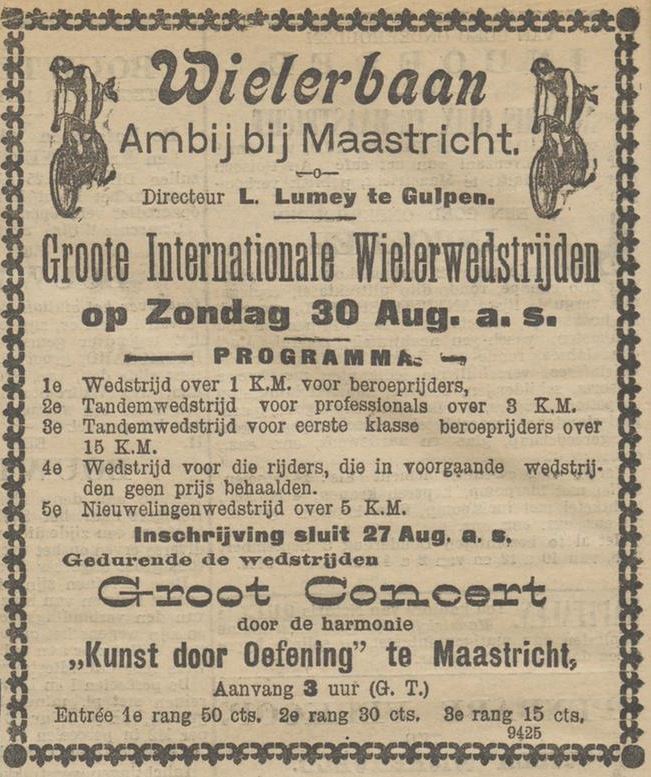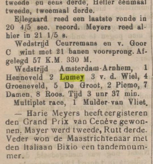 Jean Martinussen (geb. te Gulpen 23-03-1883) en Lambert Lumey (geb. te Wittem 31-03-1881) vertelden in een interview met het Limburgsch Dagblad (23-09-1950) over hun rennersleven in het eerste decennium van de vorige eeuw. Over toen zij de Zuid-Limburgse wegen met hun Alcyon’s onveilig maakten, wielerwedstrijden van alle soort en afmeting in binnen- en buitenland reden en bijna roekeloos met hun sterke krachten omsprongen, als kende het menselijk uithoudingsvermogen geen grenzen. Zij lééfden, áls zij maar fietsen konden en bekreunden zich niet om plasregens en orkanen, klaagden niet over de barbaarse toestand, waarin de wegen verkeerden en kenden geen vermoeidheid als zij wedstrijden van bij de 400 km hadden gereden.Beiden maakten naam in binnen- én buitenland.