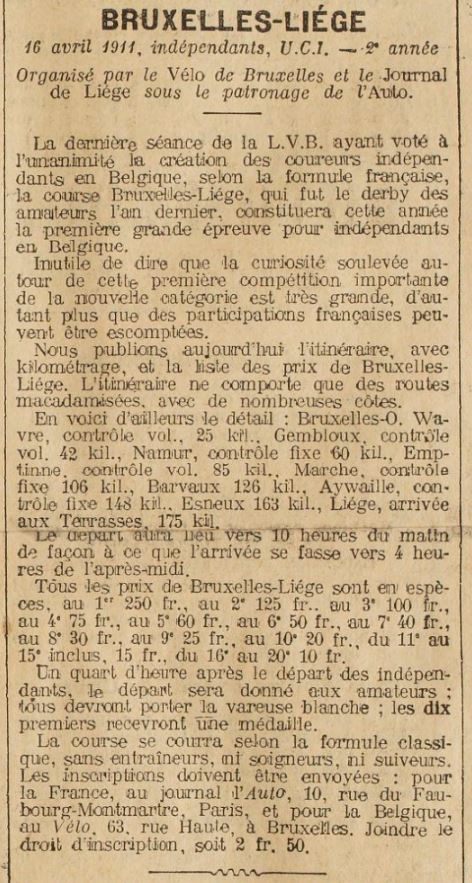 BRUSSEL-LUIK voor onafhankelijken en amateurs Georganiseerd door de Journal Le Vélo en Journal de Liége, met medewerking van dagblad L’AUTO. Alles bij elkaar genomen is Brussel-Luik voor België wat Paris-Roubaix is voor Frankrijk, met het verschil dat Bruxelles-Liége is gereserveerd voor onafhankelijke en amateurrenners. We zeggen onafhankelijken, omdat op dit moment in België een overeenkomst wordt gesloten over deze kwestie en over de nieuwe categorie zal worden gestemd worden tijdens de vergadering in maart, waarbij de tegenstanders van de nieuwste kunst de voorstellen van vandaag zijn geworden. Brussel-Luik staat daarom open voor beide categorieën met speciale prijzen voor elk van hen. De amateurs zullen rijden voor medailles; onafhankelijken ontvangen prijzen in contanten en objecten. Zo ontvangt de eerste in de onafhankelijke categorie tweehonderdvijftig frank in contanten; de andere prijzen zullen in verhouding zijn. De route Brussel-Luik over 170 kilometer volledig geasfalteerde wegen: Brussel, Waver, Gembloux. Namen, Marche, Luik, door het prachtige land van de Ardennen. De aankomst zal plaatsvinden in Luik, op Les Terrasses, waar drie jaar geleden de aankomst van Paris-Liége plaatsvond, op een bewonderenswaardige rechte lijn van macadam van twintig meter breed. Het is te hopen dat de Franse onafhankelijken “de eerste briljante kans die hen wordt geboden” niet zullen missen om zich aan te passen aan de nieuwe Belgische onafhankelijken. Inschrijvingen worden ontvangen ten kantore van de krant Le Vêlo, rue Haute 63, in Brussel. inschrijfgeld 2 fr. 50.