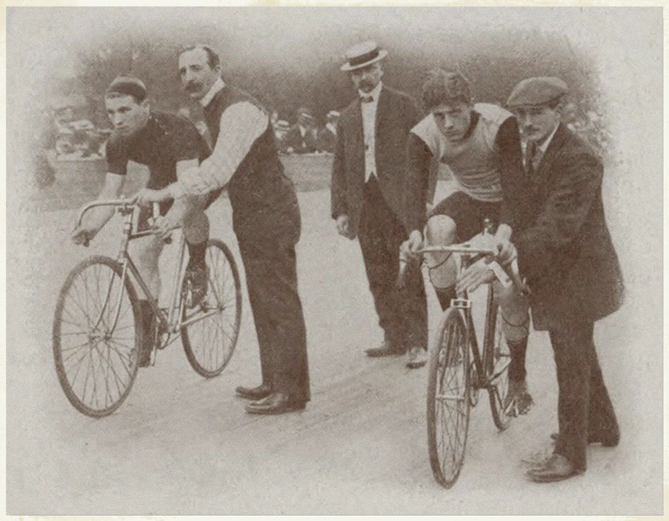 Hun namen werden met ontzag en bewondering door de toenmalige wielerfans in België, Frankrijk en Duitsland uitgesproken. Dat was rond de jaren 1905, toen de coureurs nog niet over de gladde wegen van thans gleden en ook niet het lichte, elegante materiaal van tegenwoordig met z’n veelvoud aan versnellingen kenden. De wegen mochten die naam toen niet hebben en ’n racefiets, zonder een versnelling woog toen nog altijd 12 kg. Zij haalden oude herinneringen op, schots en scheef door elkaar, van de ene wedstrijd op de ander springend, Martinussen met felle gebaren en in het ongekuiste wielerjargon soms, Lumey bedachtzamer en met meer zorg zijn woorden kiezend, beiden met een jongensachtige pret in hun ogen, omdat zij nog eens over die tijd konden praten, daarbij namen noemend van renners en officials, die lang tot hun vaderen verzameld zijn.