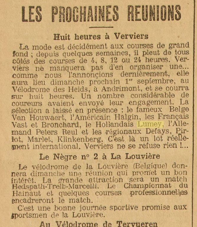 L’Auto 30 août 1907, de 8 uren van Verviers, een van de vele krantenknipsels waarin Lambert Lumey vermeld staat