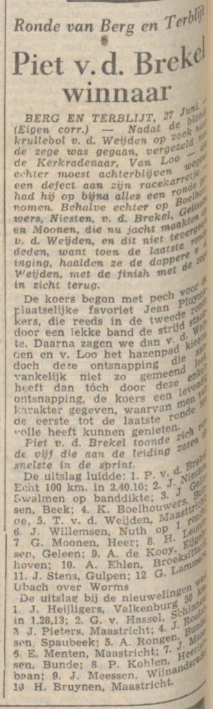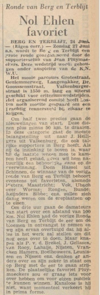 Om drie uur gaan de amateurs van start over een afstand van 100 km. Nol Ehlen had de vorige Ronde Van Berg en Terblijt de eer om de bloemen in ontvangst te nemen en wij zijn ervan overtuigd dat hij alles in het werk zal stellen om dit nog eens over te doen. Maar knapen als v. d. Brekel, J. Gelissen, van Rooy, Lahaije, Nieskens, Vrancken, Hamers, Boelhouwers, Leunissen enz. denken er anders over en zijn zeker in staat om op Berg met de eer te gaan strijken.