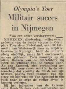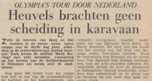 Hub Harings vertelde me van zijn zege in de 3e etappe van Olympia’s Ronde van Nederland in 1959, de rit naar Nijmegen. Hub: “Ik reed op kop door de bocht op het kazerneterrein om de sprint aan te trekken voor van Egmond, er lag daar grind. Volgens velen reed ik daar te rap maar kwam goed door de bocht. Achter me kraakte het echter, een aantal renners waaronder ook Ab van Egmond sloegen tegen de grond. Ik trok door en won met een nog 50-tal meters voorsprong”.