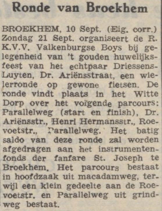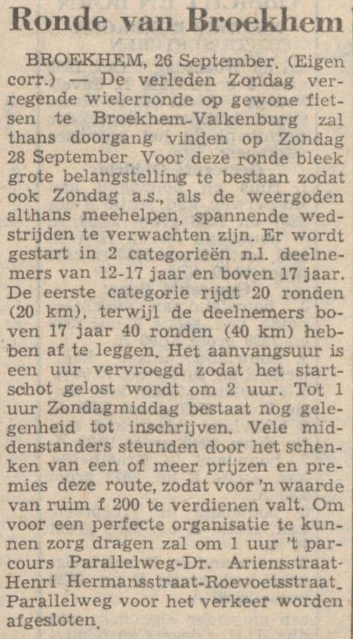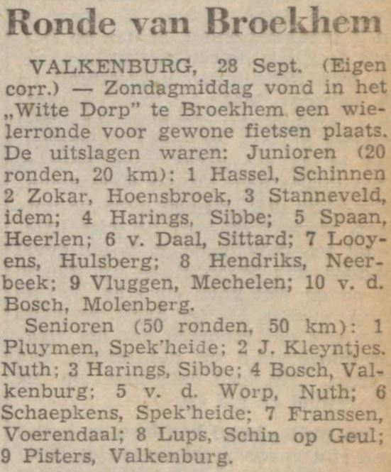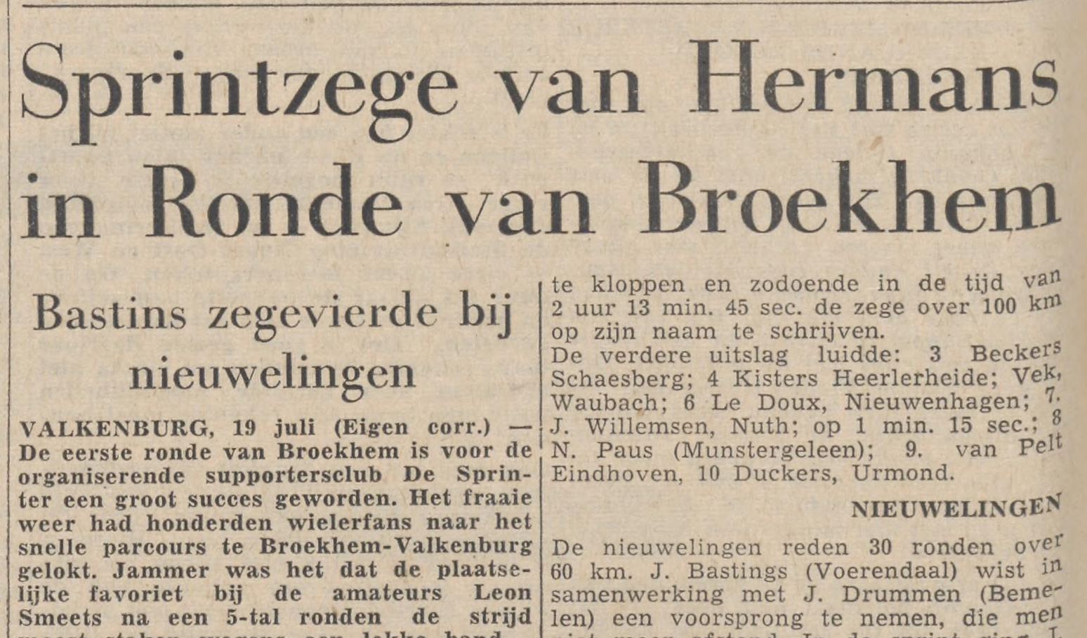 Valkenburg. De eerste ronde van Broekhem is voor de organiserende supportersclub De Sprinter een groot succes geworden. Het fraaie weer had honderden wielerfans naar het snelle parcours te Broekhem-Valkenburg gelokt. Jammer was het dat de plaatselijke favoriet bij de amateurs Leon Smeets na een 5-tal ronden de strijd moest staken wegens een lekke band. Beckers uit Schaesberg gooide halverwege het lont in het kruitvat en trok er op uit gevolgd door Duckers uit Urmond. Samen liepen zij een kwart ronde uit. Fel werd echter het tweetal achtervolgd door Hermans (Valkenburg), Hendricks (Sittard), Le Doux (Nieuwenhagen) en Kisters (Heerlerheide). Inde 31e ronde had men de vluchtelingen achterhaald. Het peloton volgde op 500 meter. Enkele ronden voor het einde veroverde Hendricks de leidersprijs, de prijs voor de renner die de meeste keren als eerste doorkwam. In de eindsprint wist de Valkenburgse favoriet Hermans Hendricks op de streep te kloppen en zodoende in de tijd van 2 uur 13 min. 45 sec. de zege over 100 km op zijn naam te schrijven.