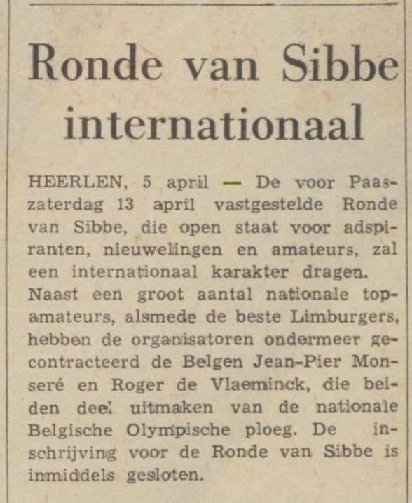Paas-zaterdag 14 juni Ronde van Sibbe Het wielercomité van Sibbe, dat al vele jaren met succes cyclo-crosswedstrijden organiseerde, houdt zaterdagmiddag een wielerronde van amateurs, nieuwelingen en adspiranten. Op een fraai, 2300 meter lang circuit zal deze Ronde van Sibbe plaatsvinden en een groot aantal renners zal er aan deelnemen. Het aantal inschrijvingen was zo groot dat vele renners teleurgesteld moesten worden. We vragen ons af of het niet hoog tijd wordt dat organisatoren in hun programma twee nieuwelingenwedstrijden gaan opnemen anders zullen elke week opnieuw vele van deze renners langs de kant moeten blijven staan. Om 13.00 uur bijten de adspiranten de spits af van de Sibber wielerronde en opnieuw zal het er spannend toegaan. Tot de favorieten behoren ondermeer Dohmen, Keijers, Klinkers, Spronkmans en Vasmeer. De nieuwelingen gaan om 13.45 uur van start en ook hier zijn een groot aantal kanshebbers voor de zege. We noemen o.a. Deckers, Dohmen, Hendriks. Meijs, Koken, Koot, Schetters, Sijen, Driessen en Odekerken. Het hoofdnummer, de amateurrace, begint om 15.00 uur. Naast vrijwel alle bekende Limburgers, onder wie Harings, Knubben, Leenders, Vrancken, van Pol, Krekels, Keybeck en verder de Belgen Geelen, Monseré en De Vlaeminck.