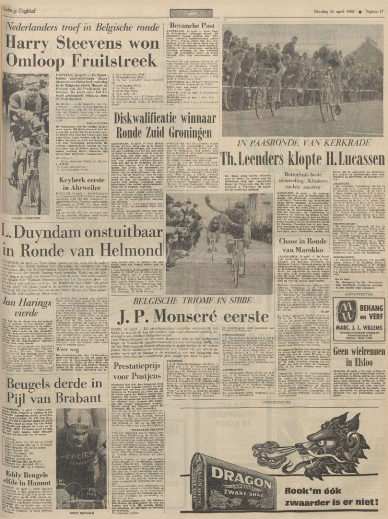 De zaterdagmiddag verreden wielerronde van Sibbe is, wat de 92 km (40 ronden) race voor amateurs betreft, geëindigd in een dubbele Belgische triomf. Zegekoning Jean-Pierre Monseré uit het verre Roeselare won terwijl zijn boezemvriend Roger De Vlaeminck (amateurwereldkampioen cyclocross 1968), die uit het Westvlaamse Eeklo afkomstig is, legde beslag op de tweede plaats. Beide zuiderburen bewerkten hun triomf via een attent gereden wedstrijd en daarna in de eindsprint van een kopgroep van dertien renners de concurrentie geen schijn van kans te geven.