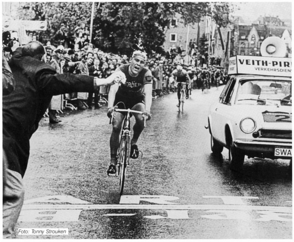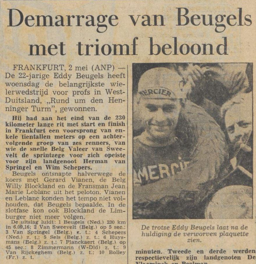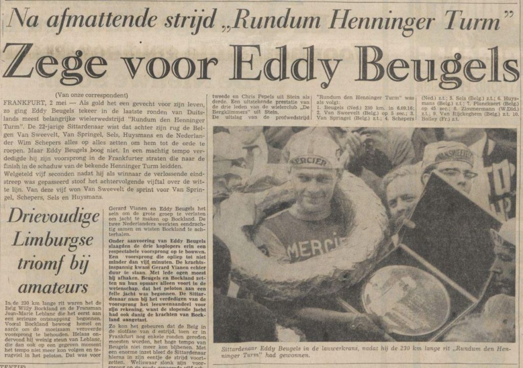 FRANKFURT, 2 mei 1968 — Als gold het een gevecht voor zijn leven, zo ging Eddy Beugels tekeer in de laatste ronden van Duitslands meest belangrijke wielerwedstrijd “Rundurn den Henninger Turm”. De 22-jarige Sittardenaar wist dat achter zijn rug de Belgen Van Sweevelt, Van Springel, Sels, Huysmans en de Nederlander Wim Schepers alles op alles zetten om hem tot de orde te roepen. Maar Eddy Beugels boog niet. In een machtig tempo verdedigde hij zijn voorsprong in de Frankfurter straten die naar de finish in de schaduw van de bekende Henninger Turm leidden. Welgeteld vijf seconden nadat hij als winnaar de verlossende eindstreep was gepasseerd stoof het achtervolgende vijftal over de witte lijn. Van deze vijf won Van Sweevelt de sprint voor Van Springel, Schepers, Sels en Huysmans.
