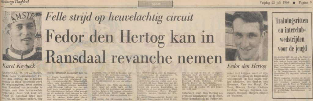 Nederlands beste wieleramateur, Fedor den Hertog, die afgelopen Zondag in Beek onttroond werd als wegkampioen, komt zondag naar Ransdaal om revanche te nemen voor deze onverwachte nederlaag. Kost wat kost wil Fedor in Ransdaal laten zien dat hij, en niemand anders, nog steeds amateur nummer één is. Het fraaie, heuvelachtige circuit in Ransdaal leent zich uitstekend voor een revanchewedstrijd.