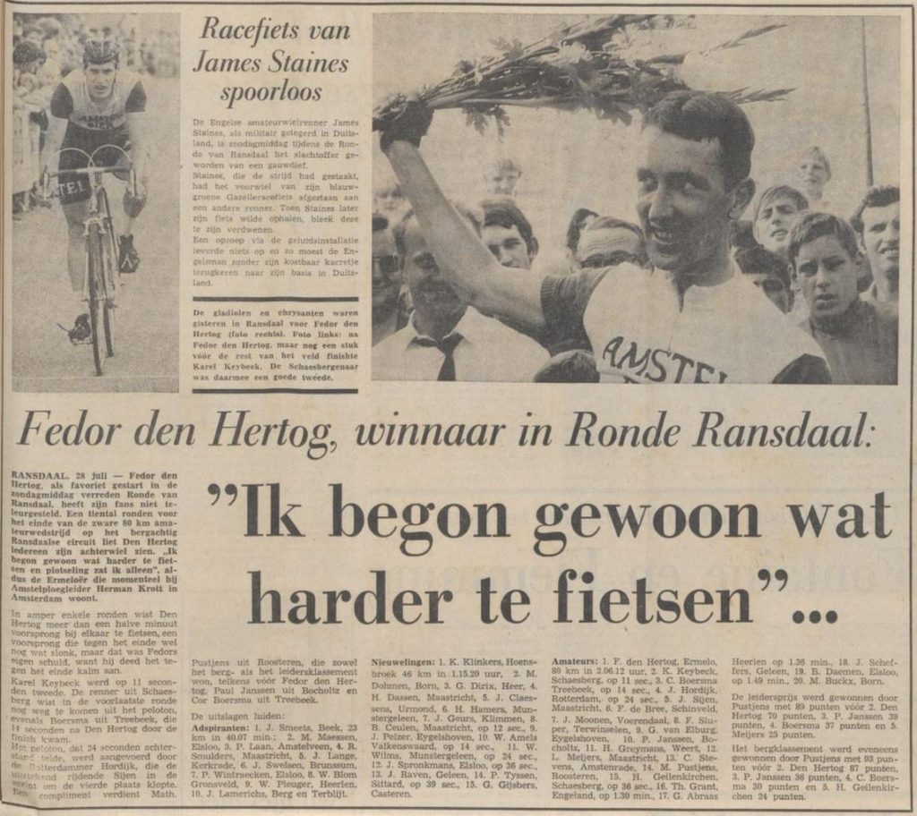 De Engelse amateurwielrenner James Staines, als militair gelegerd in Duitsland, is zondagmiddag tijdens de Ronde van Ransdaal het slachtoffer geworden van een gauwdief. Staines, die de strijd had gestaakt, had het voorwiel van zijn blauwgroene Gazelleracefiets afgestaan aan een andere renner. Toen Staines later zijn fiets wilde ophalen, bleek deze te zijn verdwenen. Een oproep via de geluidsinstallatie leverde niets op en zo moest de Engelsman zonder zijn kostbaar karretje terugkeren naar zijn basis in Duitsland.