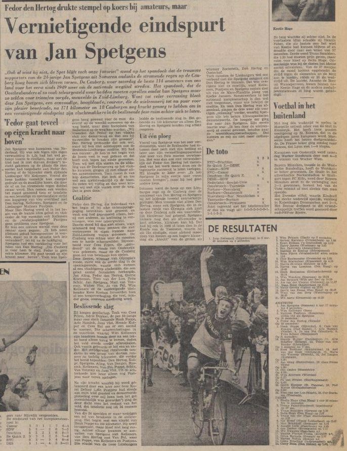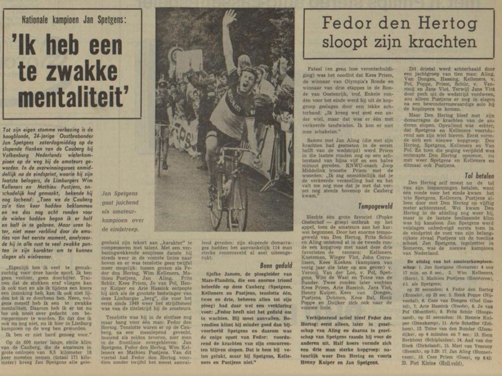 Jan Spetgens was kampioen van Nederland. Hij was ook tegen zijn eigen verwachting in („ik had het wel gehoopt voorin te eindigen, maar aan de titel had ik niet durven denken”) terecht gekomen op de plaats die men i eerder had toegedacht aan Fedor den Hertog of de bijzonder sterk rijdende Limburger Wim Kelleners. Vooral die twee hadden namelijk hun stempel gedrukt op de moeilijke koers, die dooide af en toe stromende regen dubbel zwaar werd. Hun namen ook werden het meest genoemd toen er tenslotte na een levendige en spectaculaire strijd een kopgroep van vier overbleef met Den Hertog, Kelleners, Spetgens en de Limburger Mathieu Pustjens. Maar Den Hertog werd al in het begin van de laatste klim gelost en vlak onder de top vormden ook Kelleners en de „wieltjesplakker” Pustjens geen probleem voor Spetgens. Er was een nieuwe wereld voor deze renner open gegaan. „Ik heb nooit plannen gehad beroepsrenner te worden, maar nu is de situatie, toch iets veranderd”, zei hij na de huldiging. Spetgens had een vérklaring voor het falen van Den Hertog: „Die Cauberg is voor hem te steil. Fedor is geen echte klimmer. Hij gaat teveel op zijn kracht naar boven”. Toch was Spetgens bang geweest voor de man die overal op de wereld successen op de weg boekt, maar geen kampioen van Nederland op de weg kan worden. „Wij vreesden dat Fedor op het vlakke stuk zou demarreren en dan zou hij nauwelijks te houden zijn geweest”. Den Hertog probeerde dat ook wel, maar hij kon niet ontsnappen aan de Brabants-Limburgse coalitie. Hij had een excuus: „Ik heb in het begin van de koers veel te veel gedaan en dat heeft zich tegen het einde gewroken. Toen wij met zijn vieren na de afdaling van de Dalhemerweg op het vlakke kwamen, gingen zij met elkaar zitten samenspannen. Toen moest ik van kop demarreren. Het leek af en toe wel een sprintwedstrijd op de baan. Zo reden wij vijftig en dan weer kropen wij met zijn vieren over de weg. Dat is geen doen.”