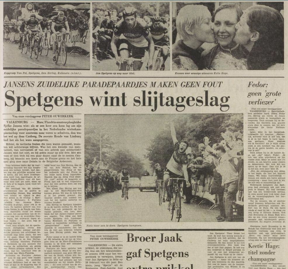 Na een barre tocht van 171 kilometer met achttien moordende klims over de Cauberg tooide „De Spet” – vijf jaar amateur en afgezien van een zege in de Omloop van de Baronie in 1969 steeds in de schaduw van de groten vertoevend – zich min of meer verrassend, maar volledig verdiend, met de hoogste eer.