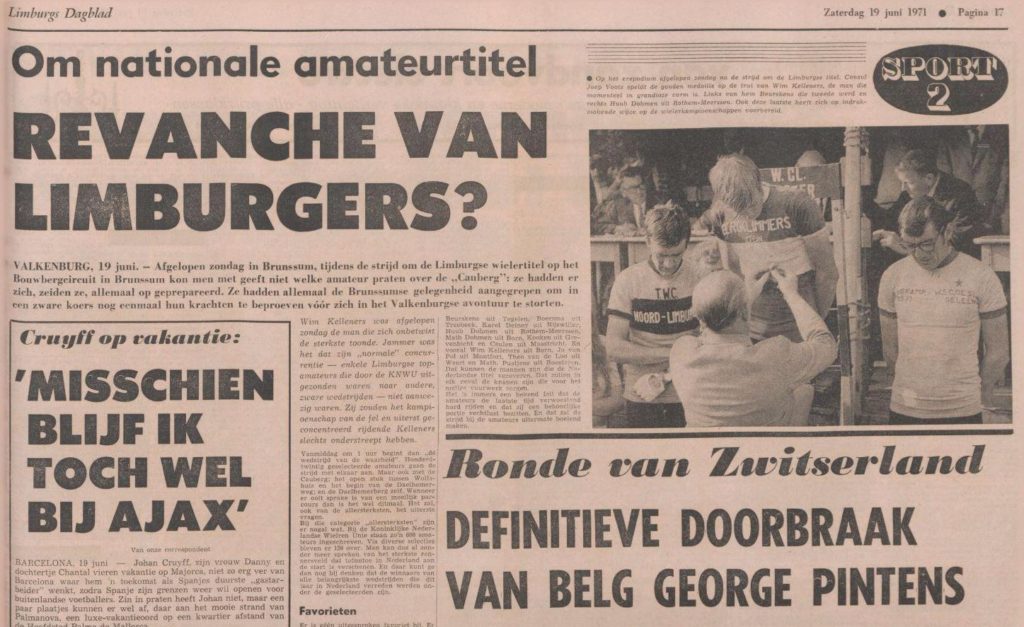 Het amateurkampioenschap in Valkenburg is de wedstrijd van de Limburgers geworden. Behalve Wim Kelleners en Mathieu Pustjens onderscheidden zich ook veel andere Limburgse coureurs temidden van de elite. Zoals Jo van Pol die ruim tevreden was over zijn achtste plaats. Commentaar van de man uit Montfort: „Ik heb griep gehad. Daarom had ik niet zoveel ambitie. Op het laatst heb ik me ingehouden, omdat mijn ploeggenoten Kelleners en Pustjens vooruit zaten. Anders was ik zeker nog verder naar voren gekomen. Fedor den Hertog heeft verloren omdat hij elke keer op het valse plat boven op de Cauberg heel moeilijk zat. Normaal zou hij daar ongenadig hebben toegeslagen, maar hij kón het niet. Dat valse plat heeft hem de das om gedaan. Ik heb duidelijk gezien dat hij daar elke ronde enorm slecht zat.”
