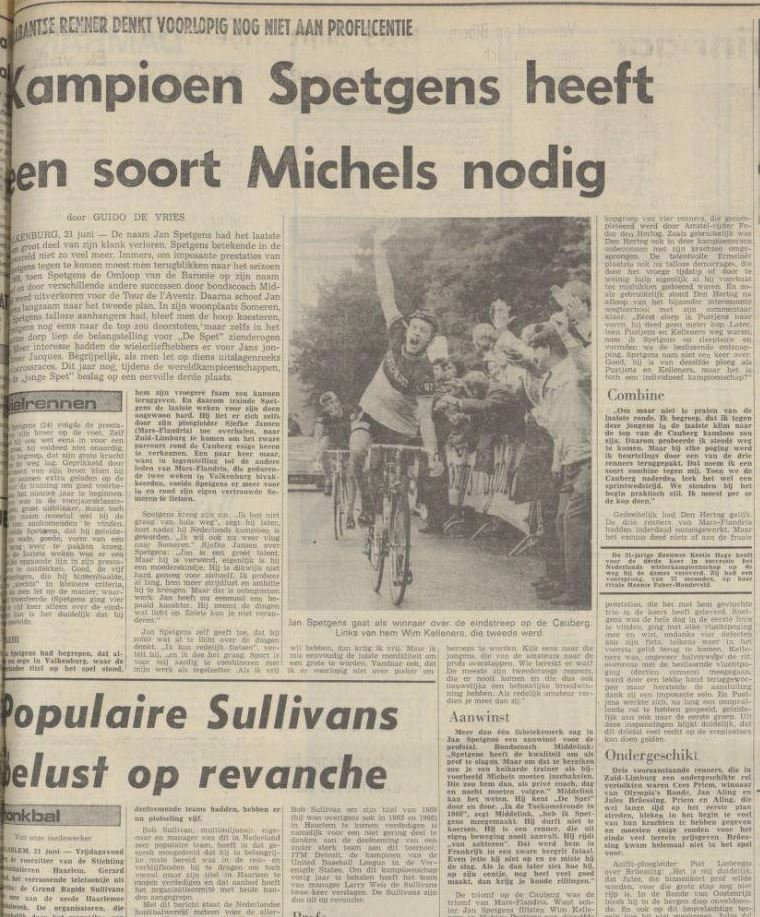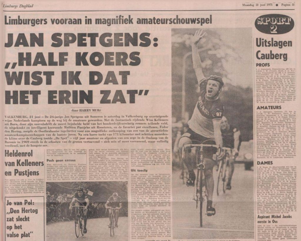 „Ook al wint hij niet, de Spet blijft toch onze favoriet” stond op het spandoek dat de trouwste supporters van de 24-jarige Jan Spetgens uit Someren ondanks de stromende regen op de Cauberg hoog boven zich bleven torsen. De Cauberg, waar zaterdag de beste 114 amateurs van ons ‘land voor het eerst sinds 1949 weer om de nationale ivegtitel streden. Het spandoek, dat de Oostbrabanders alzo vaak teleurgesteld weer hadden moeten oprollen omdat hun Spetgens maar zo zelden voor triomfen zorgde, sneuvelde in Zuid-Limburg. Want tot veler verrassing bleek deze Jan Spetgens, een eenvoudige, hoogblonde, coureur, die de wielrennerij tot nu puur voor zijn plezier beoefende, na 171 kilometer en 18 Caubergen nog kracht genoeg te hebben om m een vernietigende eindsprint zijn vluchtmakkers in de beslissende fase ruim achter zich te laten.