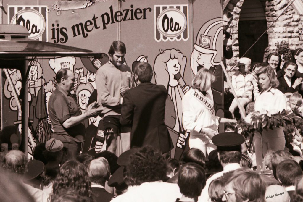 Arie Hassink vrijdagavond triomfator als de karavaan in Amsterdam de Ronde beëindigt? Hij: “Er kan, zelfs met een sterke ploeg om je heen, nog van alles gebeuren. Je kunt bovendien een slechte dag hebben, alhoewel mijn zelfvertrouwen nu toch wel groot is. Ik heb sinds mijn debuut als amateur reeds vele keren tot de deelnemers aan Olympia’s Ronde behoord. In totaal is het nu de negende maal, waarvan één keer overigens niet als renner. Dat was in het jaar dat ik door ziekte niet kon koersen. Ik fungeerde toen als mecaniciën van onze ploeg. Dit jaar behoor ik dus voor de achtste maal tot de rennerskaravaan. Ik won dikwijls de proloog en ik droeg mede daardoor vaak de oranje trui. Maar een echte etappe, zoals nu in Limburg kon ik nog nooit winnen. Dan begrijp je wel dat dit succes mij extra verheugt”. En over de rol die de Belg Goossens in de slotfase speelde: „Ik kende die jongen uit de Tour de I’Avenir. Ik wist dat hij goed kon klimmen. Hij streed trouwens ook dit keer blijk baar voornamelijk voor de bergprijs. Nadat hij zijn laatste punten had veroverd, beperkte hij zich tot verstoppertje spelen”.