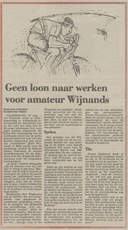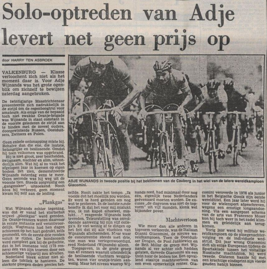 Ad Wijnands stond er zaterdagmiddag in Valkenburg teleurgesteld bij. Een kleine vier en een half uur lang had de 20-jarige wielrenner zich voor eigen publiek uitgesloofd. Bij bijna elke ontsnapping was de Limburger attent van de partij geweest, maar het loon voor die enorme inspanning was nihil. Als „onzichtbare” gleed Wijnands in 39ste positie over de eindstreep, terwijl de Italiaan Gianni Giacomini, de nieuwe wereldkampioen bij de amateurs, door een dringende mensenmassa naar het erepodium werd gestuwd. „Ik denk”, zuchtte Wijnands, „dat dit toernooi voor mij een jaar te vroeg is gekomen. Misschien was ik nog te jong en te onervaren om ook in de laatste ronde ( de “liefhebbers” moesten elf lussen van 16 kilometer afleggen) met de besten mee te gaan. Ineens blokkeerde ik tegen die Cauberg op, voelde ik de krachten uit mijn benen wegvloeien.”