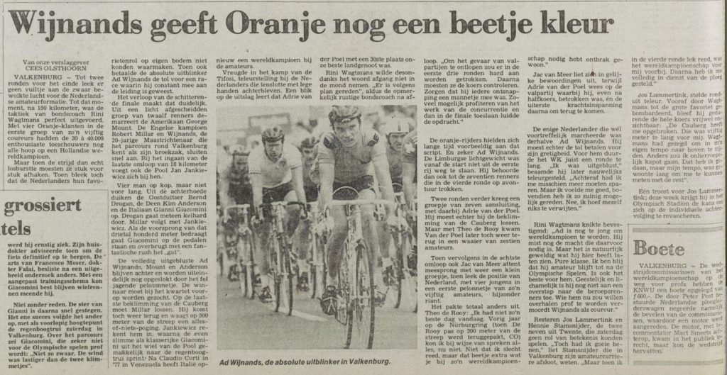 Resteren Jos Lammertink en Hennie Stamsnijder, de twee neven uit Twente, die zaterdag geen rol van betekenis konden spelen. „Toch had ik goeie benen,” liet Stamsnijder die in Valkenburg zijn amateur carrière afsloot, weten. „Maar toen ik in de vierde ronde lek reed, was het wereldkampioenschap voor mij voorbij. Daarna heb ik me volledig in dienst van de ploeg gesteld.” Jos Lammertink, stelde ronduit teleur. Vooraf door Wagtmans tot de grote favoriet gebombardeerd, bleef hij gedurende de hele koers vrijwel onzichtbaar: „De Cauberg heeft me opgebroken. Die was vijftig meter te lang voor mij. Wagtmans had gezegd om in m’n eigen tempo naar boven te rijden. Anders zou ik onherroepelijk kapot gaan. Dat heb ik gedaan, maar mijn tempo, was gewoonte laag om me te kunnen meten met de rest. Eén troost voor Jos Lammertink; deze week krijgt hij in het Olympisch Stadion de kans om zich op de individuele achtervolging te revancheren.