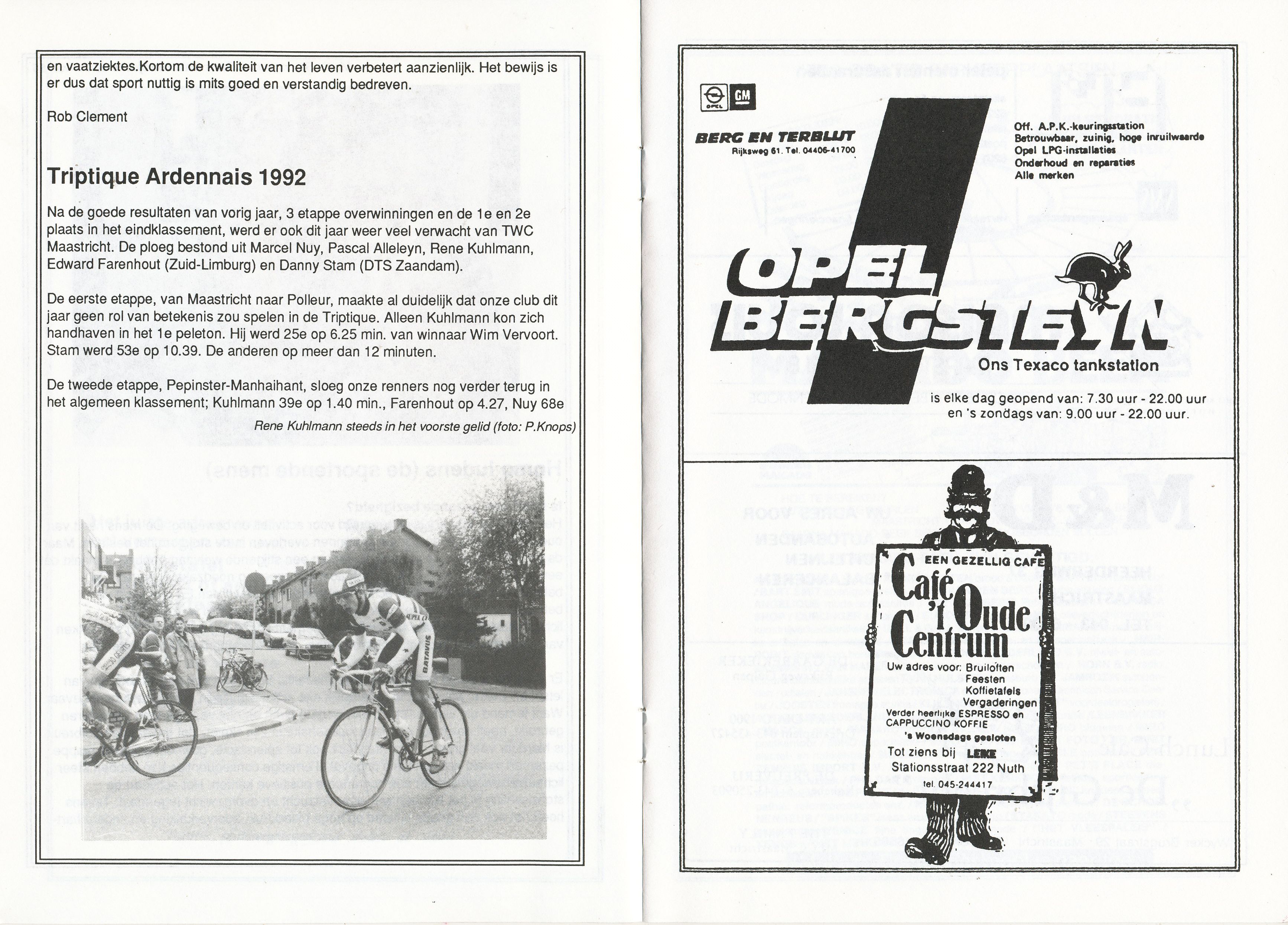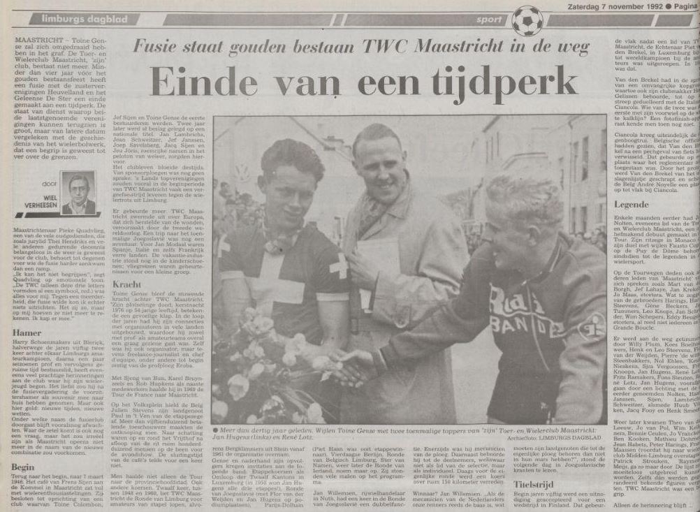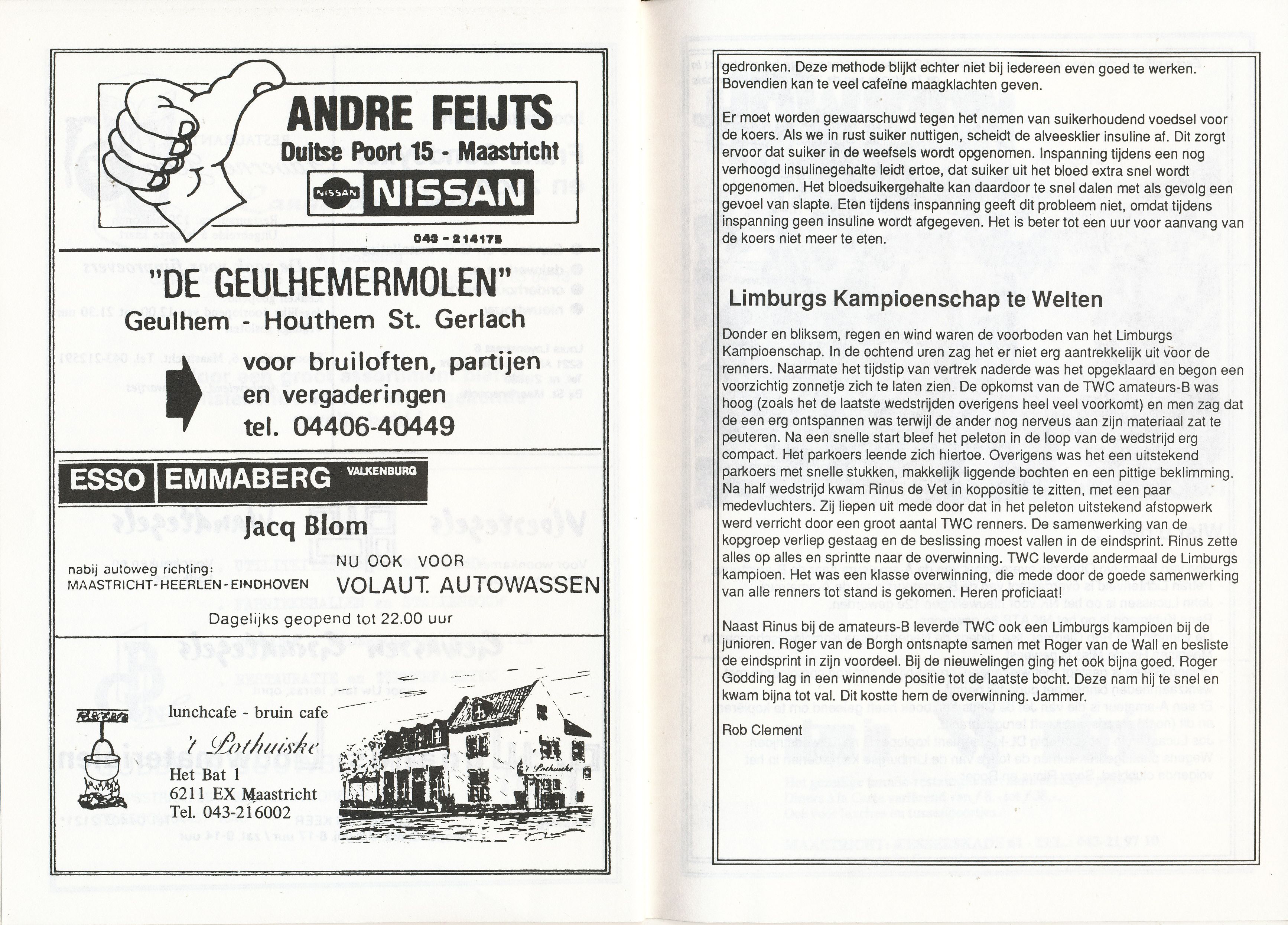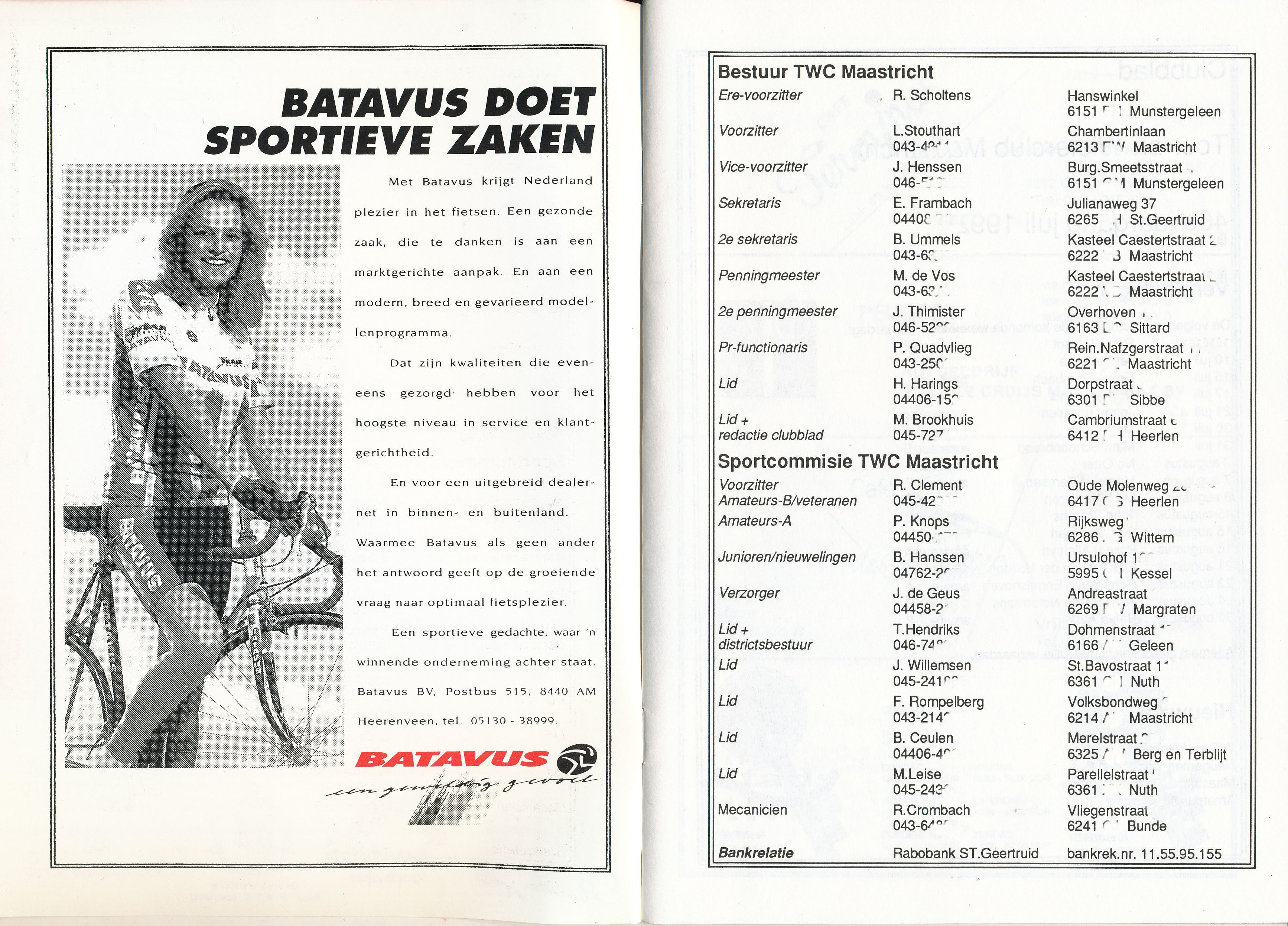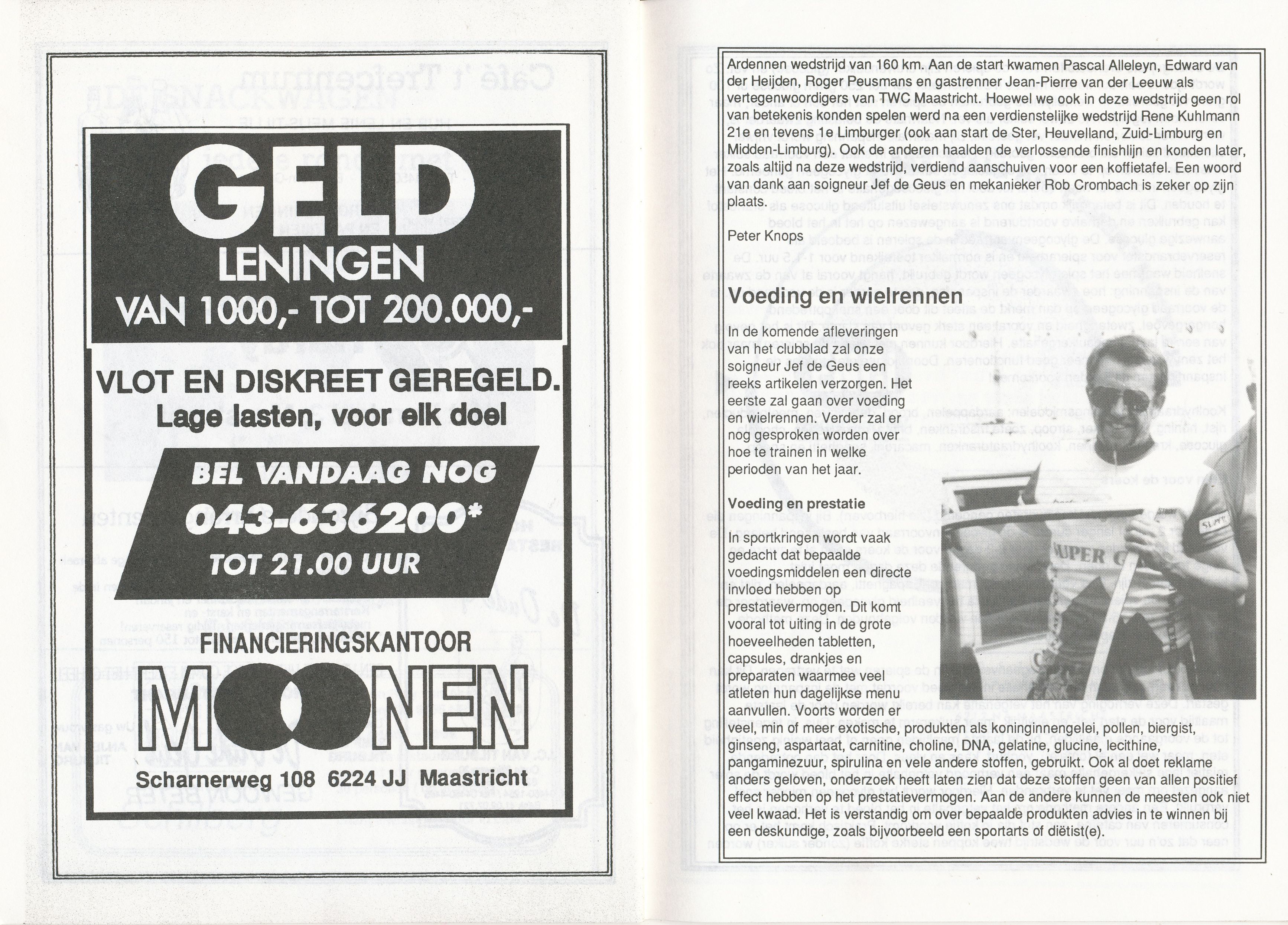 Van Jo Hendriks kreeg ik, uit zijn archief, dit clubblad cadeau. “Heb ik dubbel” zei hij, maar volgens mij met voorbedachte rade, aangezien mijn naam er een aantal keren in voorkomt, in ieder geval is het een van de laatste exemplaren van het TWC clubblad want later dat jaar zijn de fusiebesprekingen begonnen die uiteindelijk resulteerden in het opgaan van TWC Maastricht, TWC Heer en WCl de Ster Geleen in de nieuw te vormen wielervereniging TWC Maaslandster