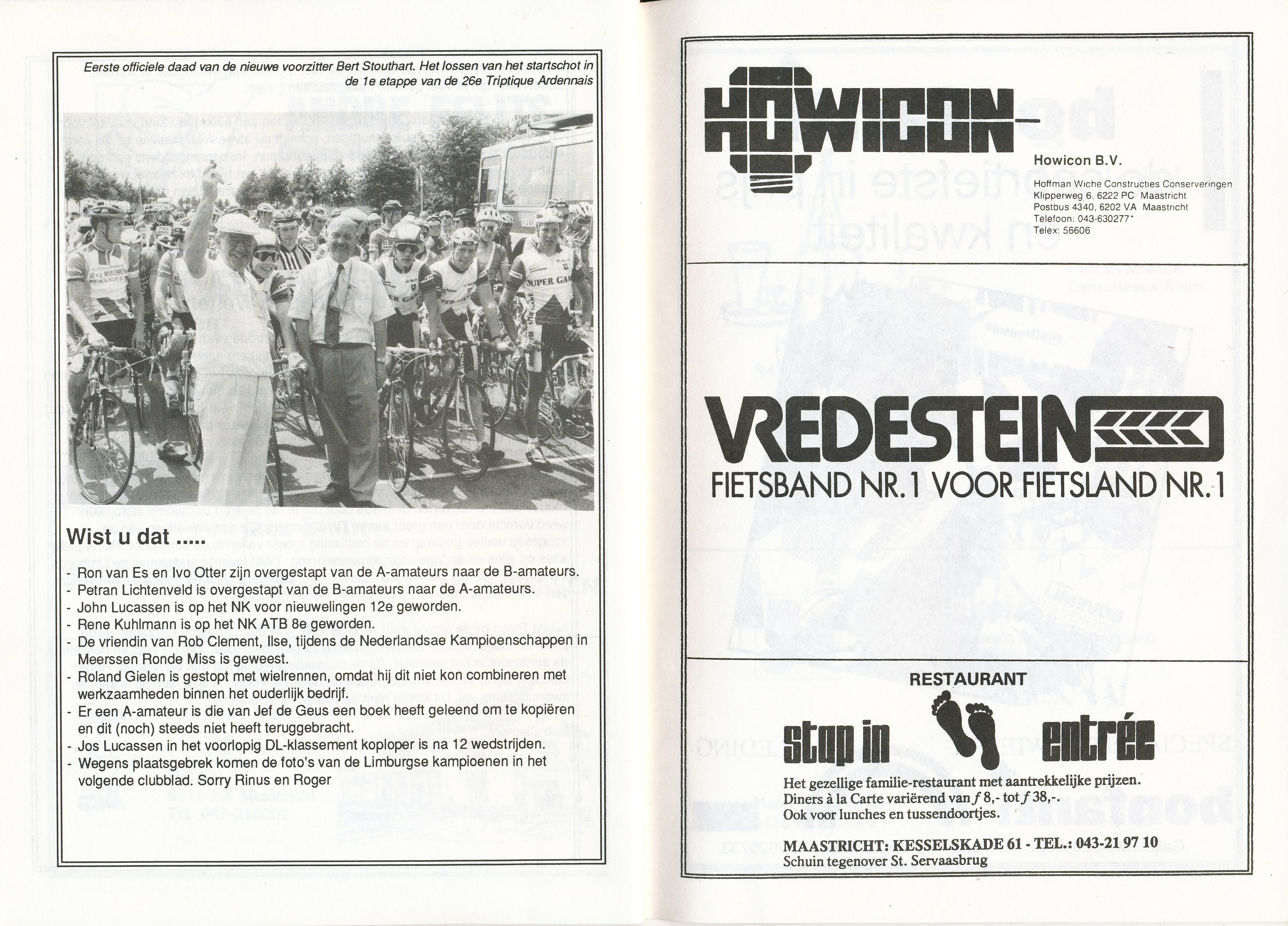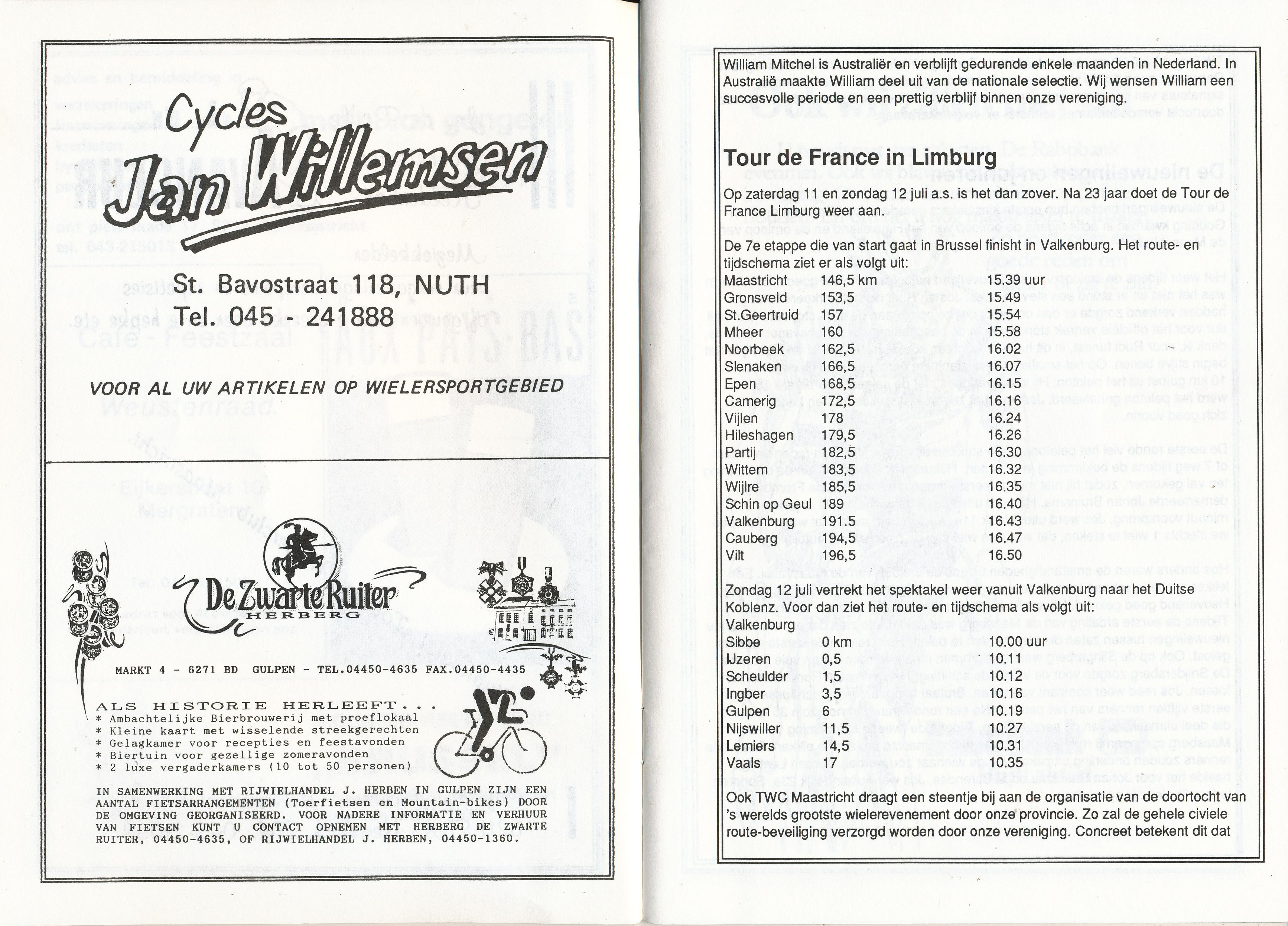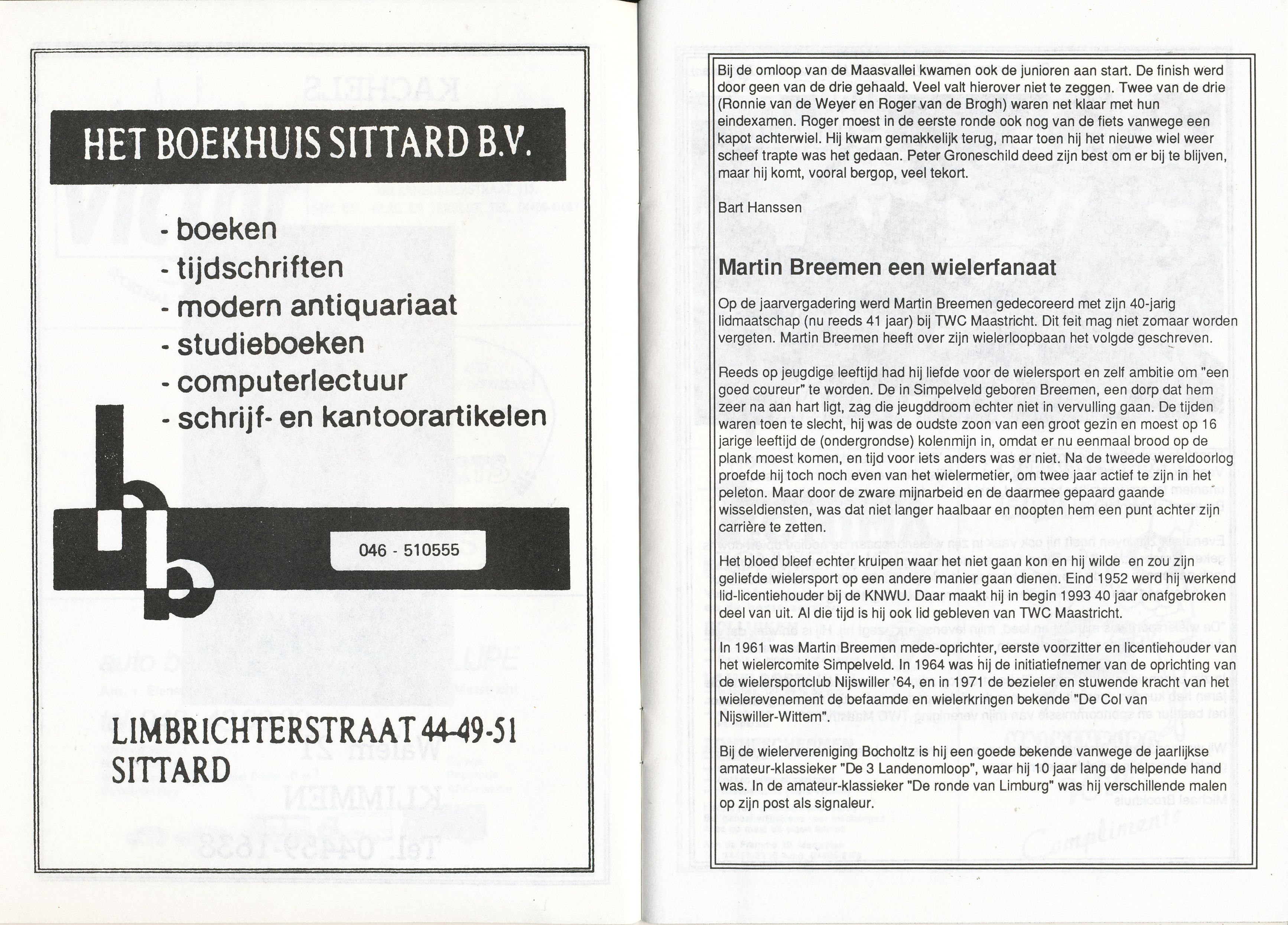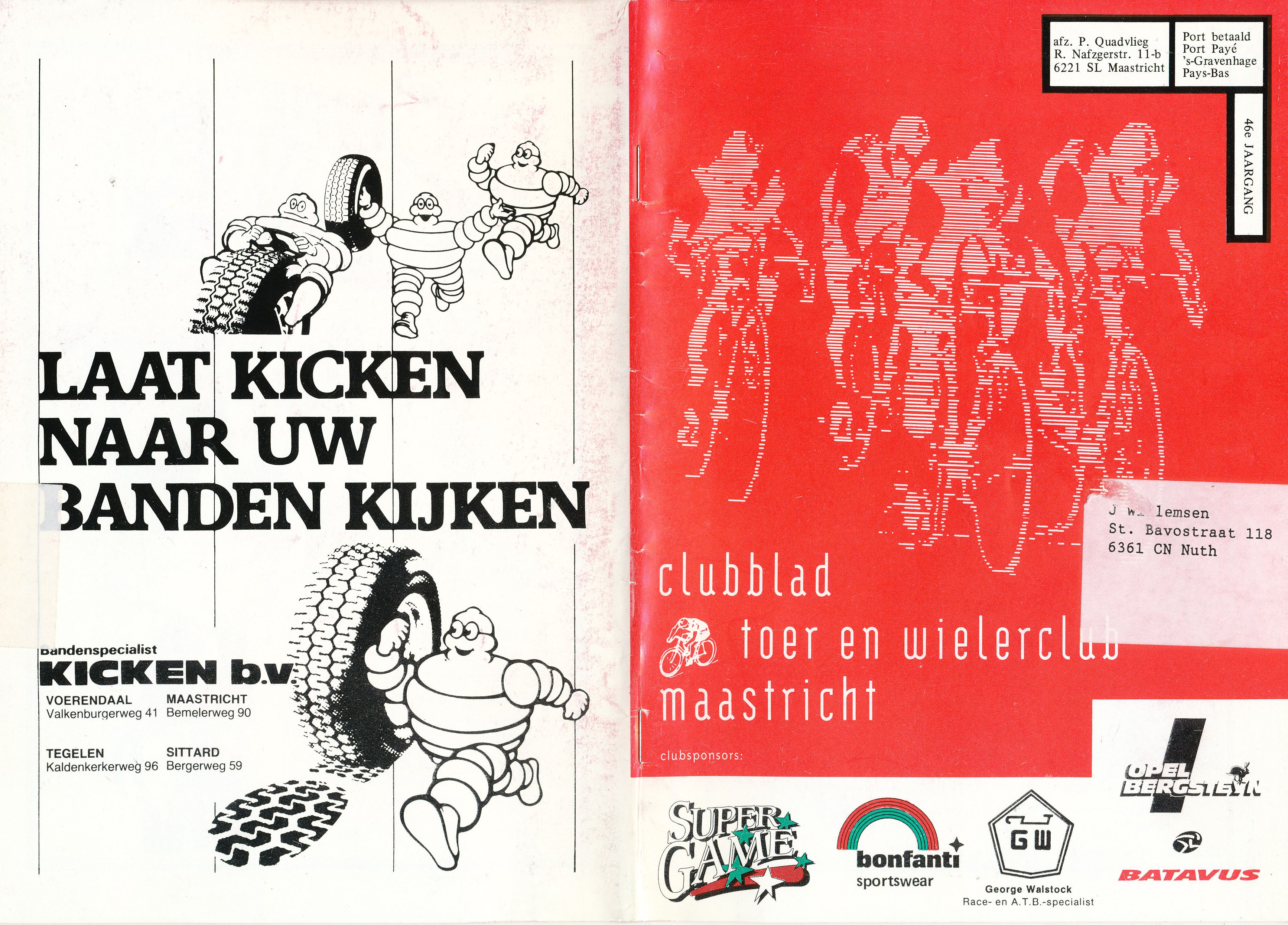 Van Jo Hendriks kreeg ik, uit zijn archief, dit clubblad cadeau. “Heb ik dubbel” zei hij, maar volgens mij met voorbedachte rade, aangezien mijn naam er een aantal keren in voorkomt, in ieder geval is het een van de laatste exemplaren van het TWC clubblad want later dat jaar zijn de fusiebesprekingen begonnen die uiteindelijk resulteerden in het opgaan van TWC Maastricht, TWC Heer en WCl de Ster Geleen in de nieuw te vormen wielervereniging TWC Maaslandster