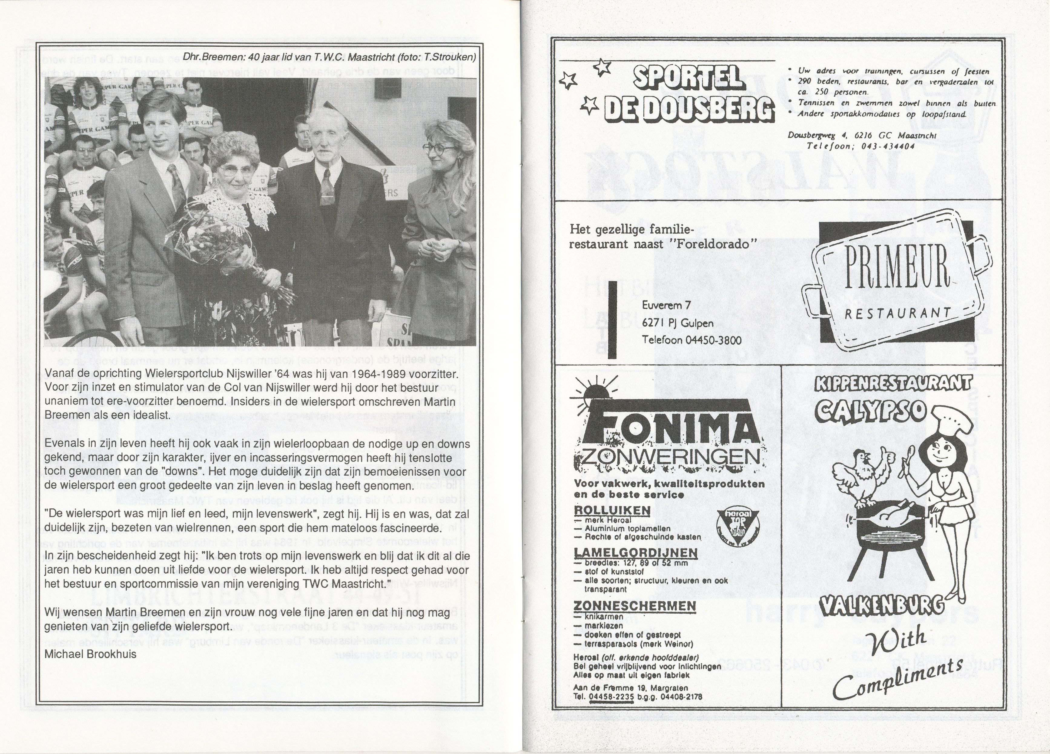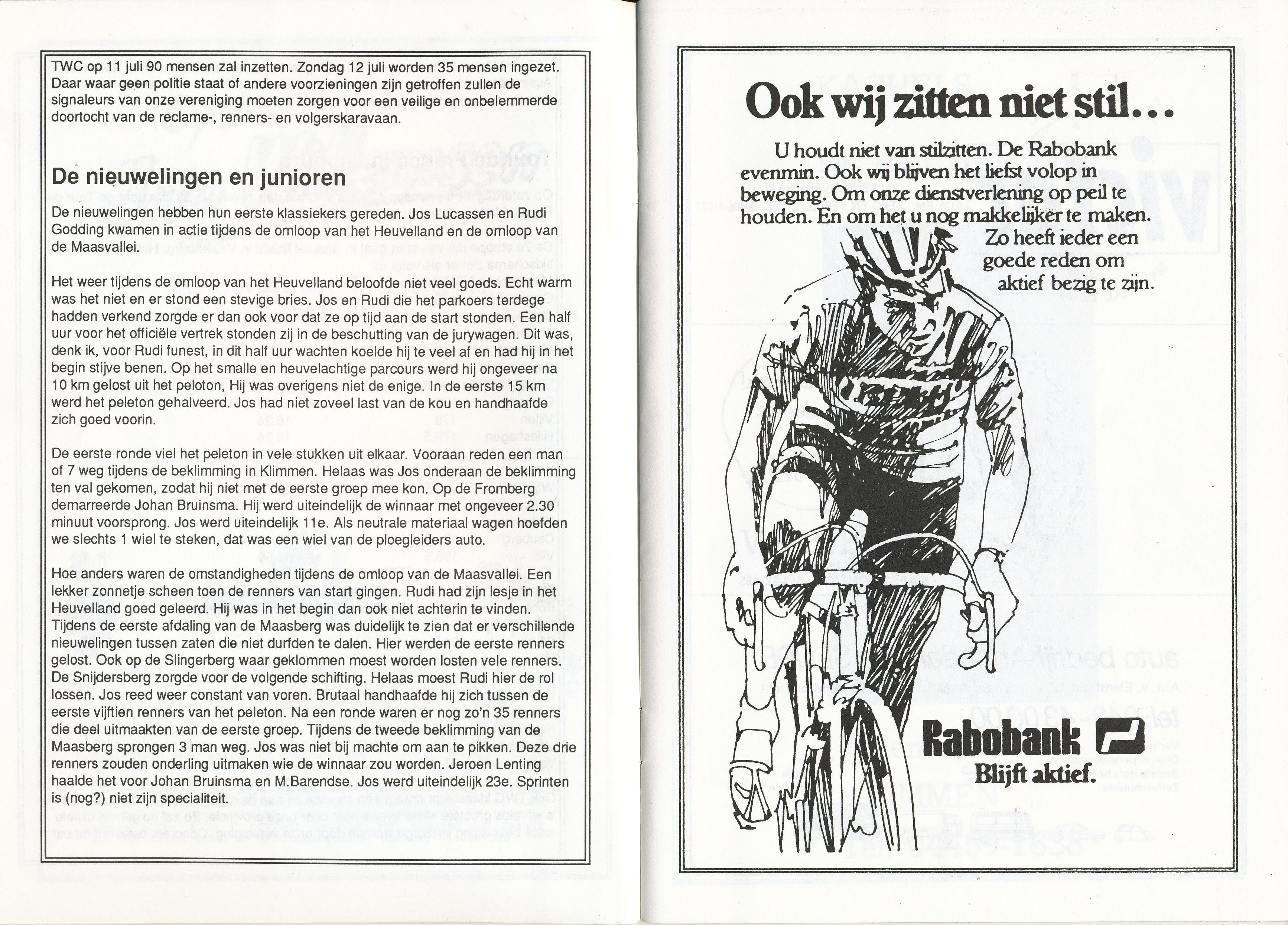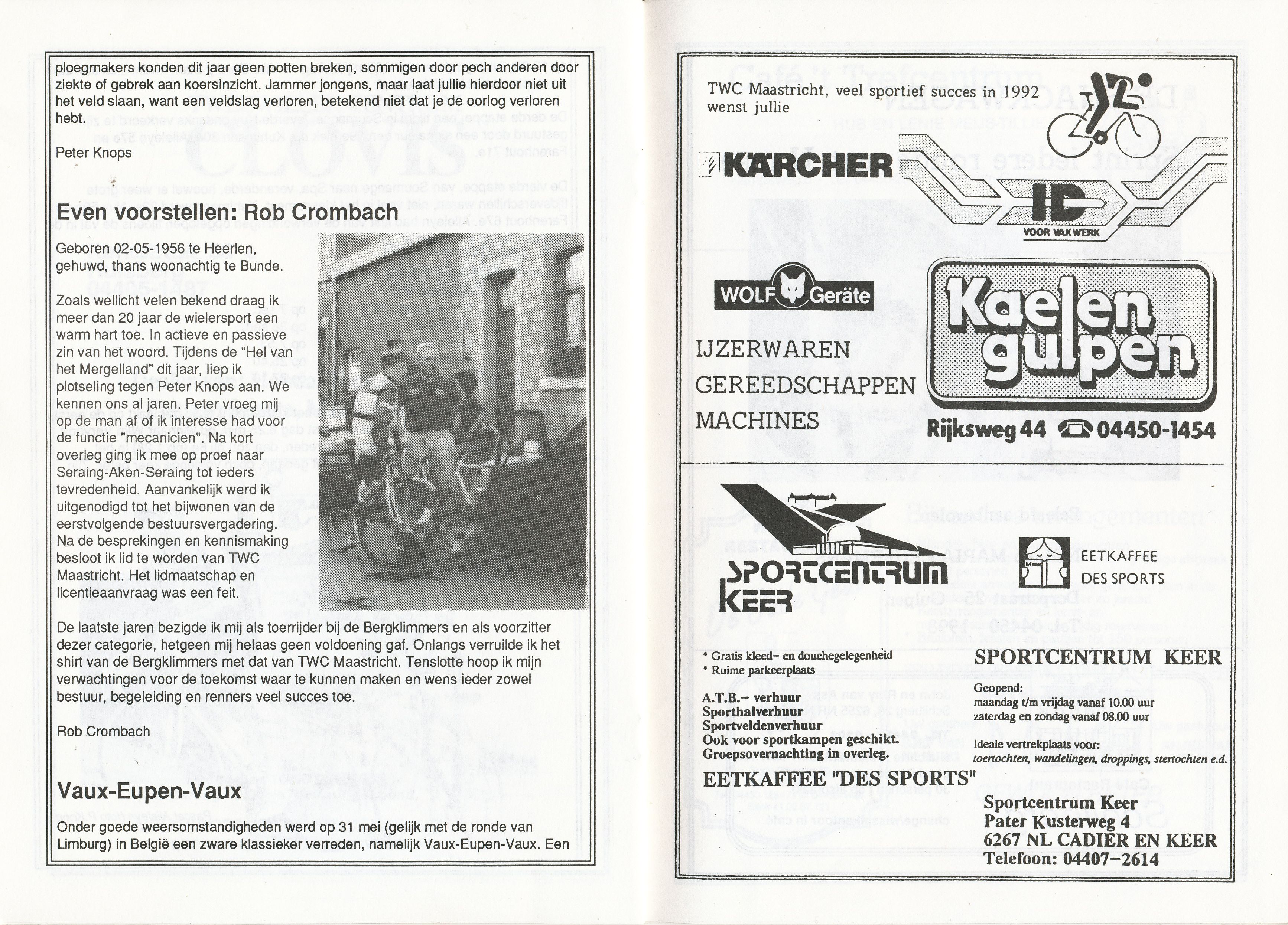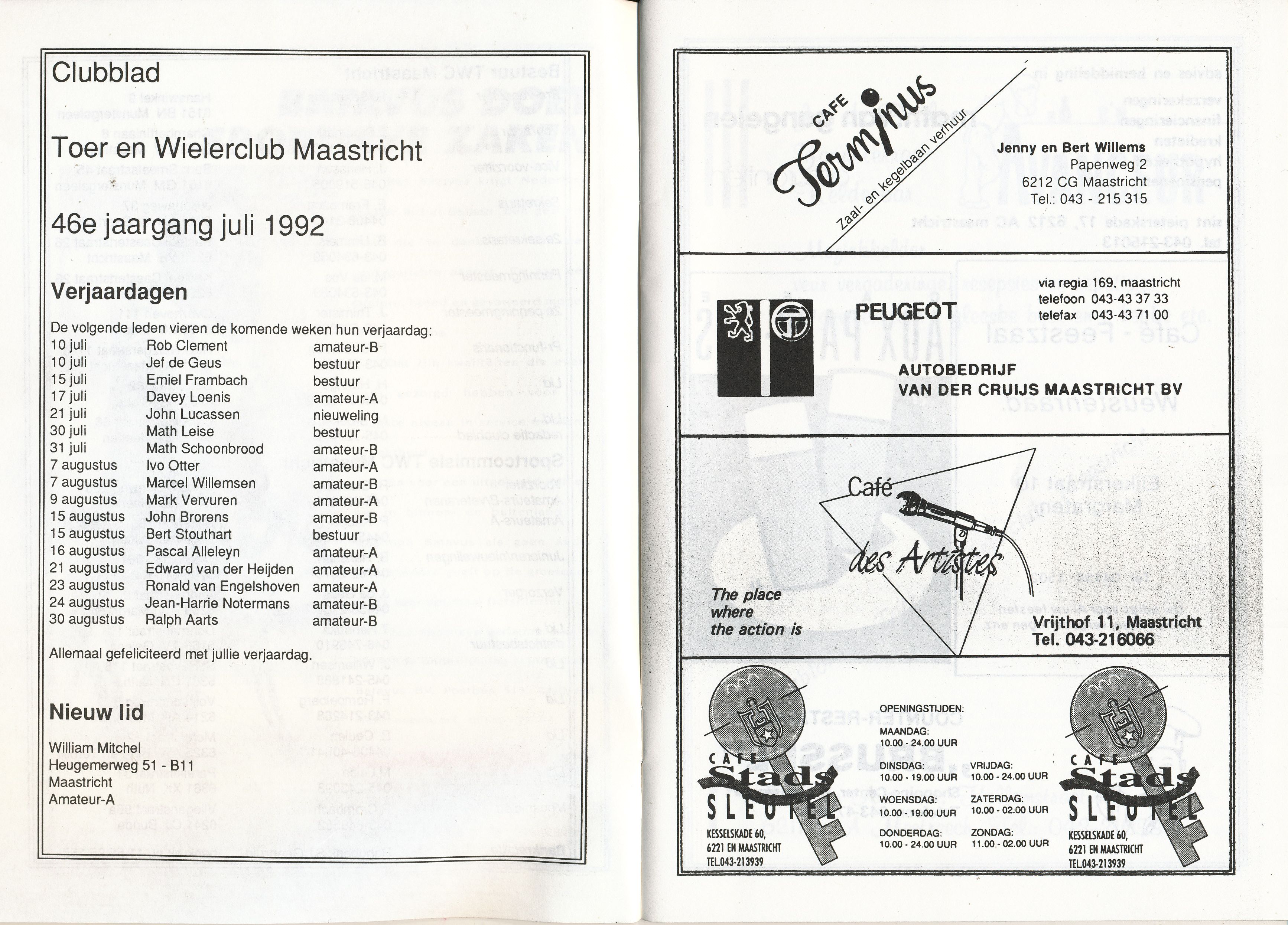 Van Jo Hendriks kreeg ik, uit zijn archief, dit clubblad cadeau. “Heb ik dubbel” zei hij, maar volgens mij met voorbedachte rade, aangezien mijn naam er een aantal keren in voorkomt, in ieder geval is het een van de laatste exemplaren van het TWC clubblad want later dat jaar zijn de fusiebesprekingen begonnen die uiteindelijk resulteerden in het opgaan van TWC Maastricht, TWC Heer en WCl de Ster Geleen in de nieuw te vormen wielervereniging TWC Maaslandster