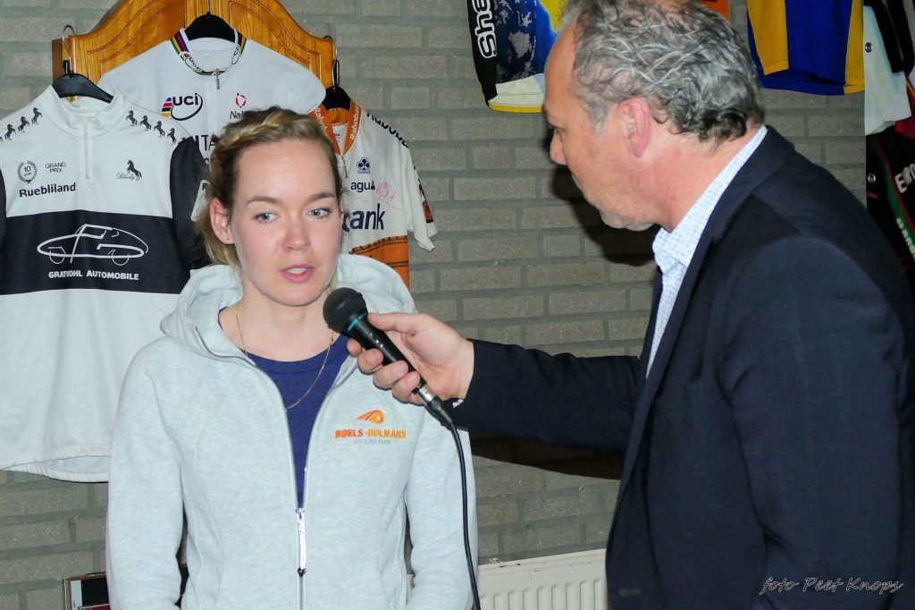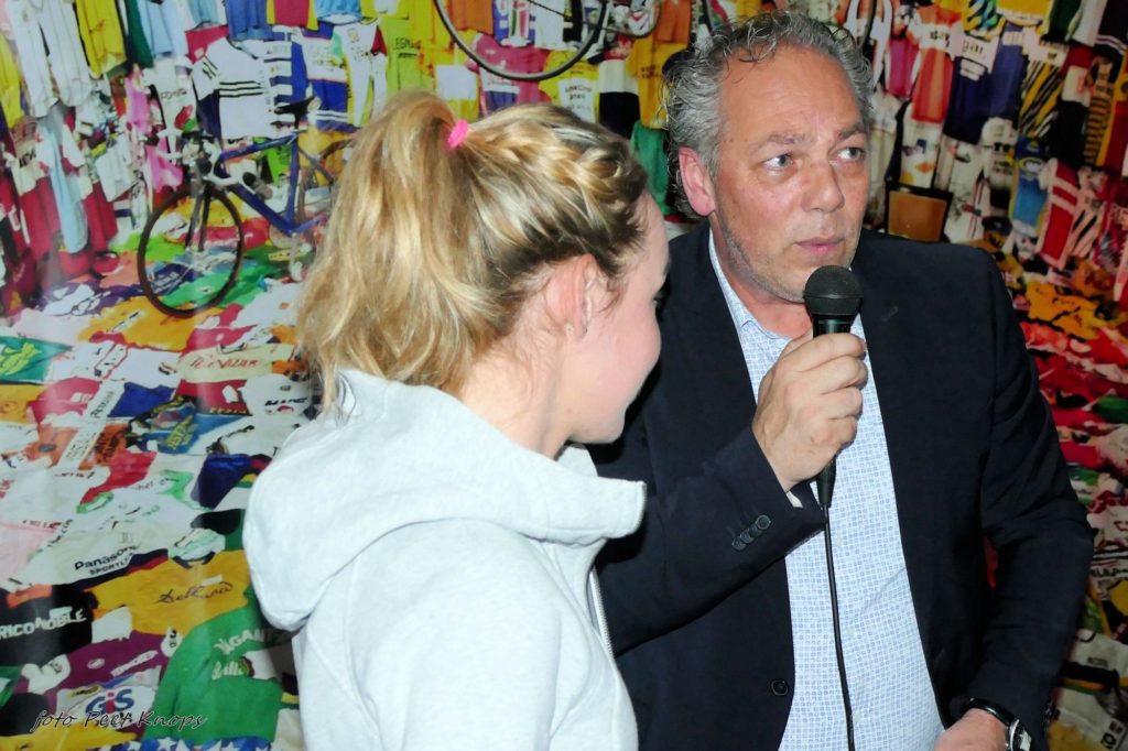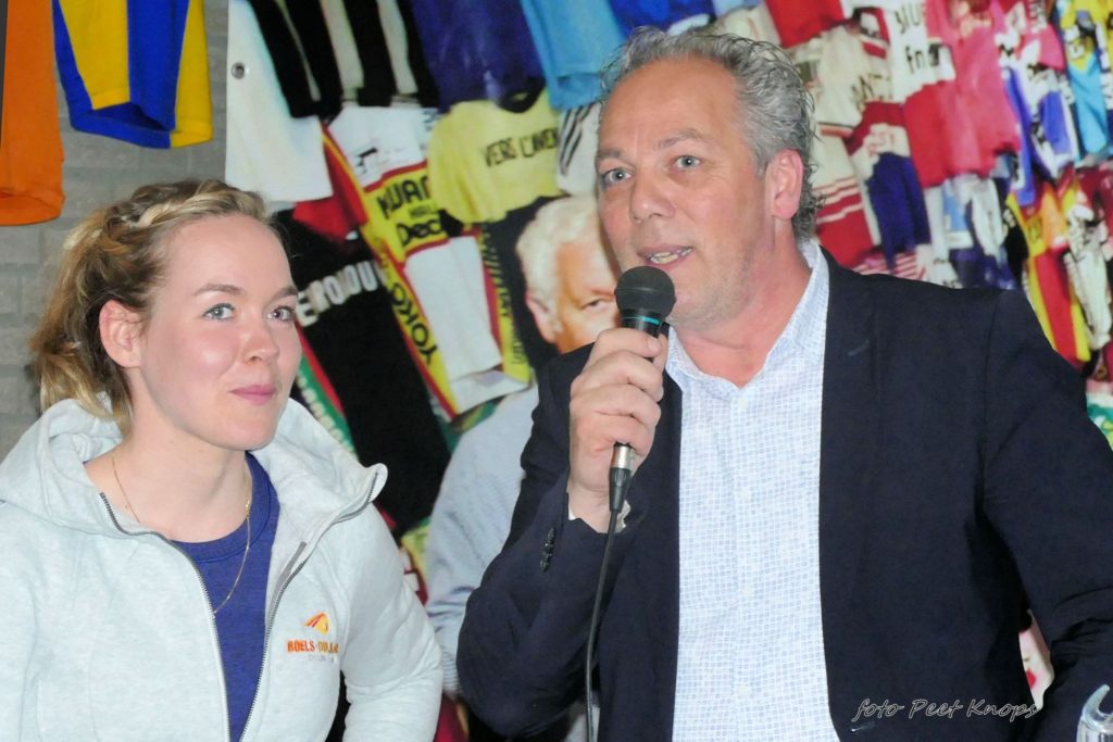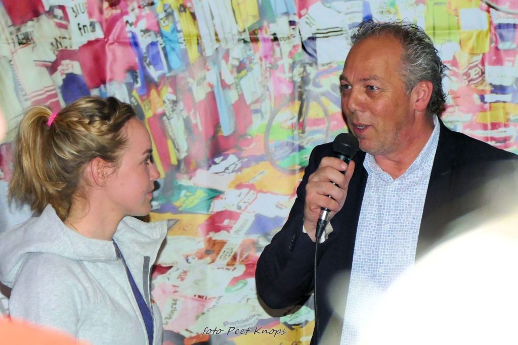 Op het podium Olympisch kampioen Anna van der Breggen, Jip van den Bos, ploegleider Danny Stam en team manager Erwin Janssen. Ze worden door “de Bergklimmers” voorzitter Peter Bouwels aan de tand gevoeld.