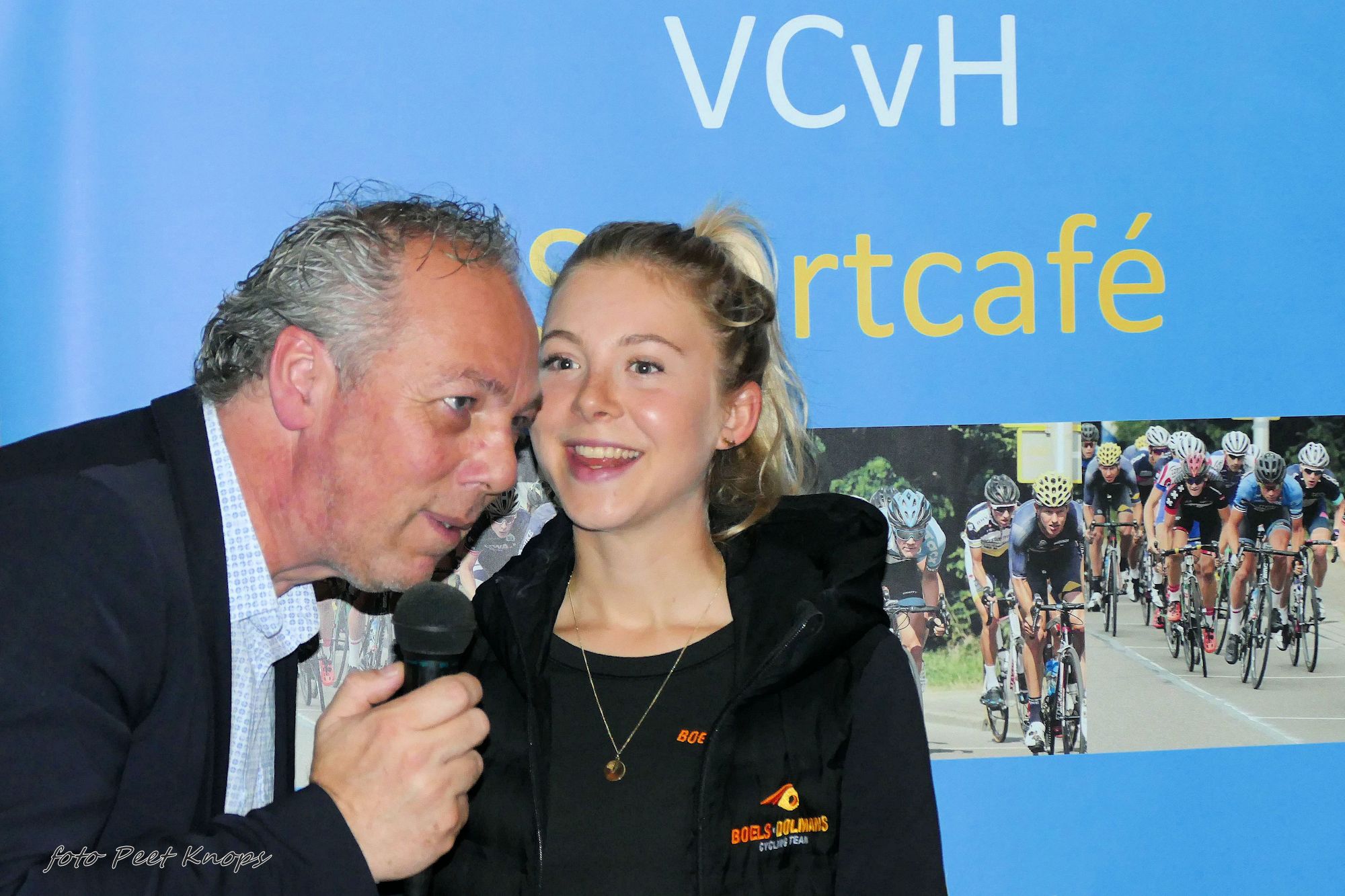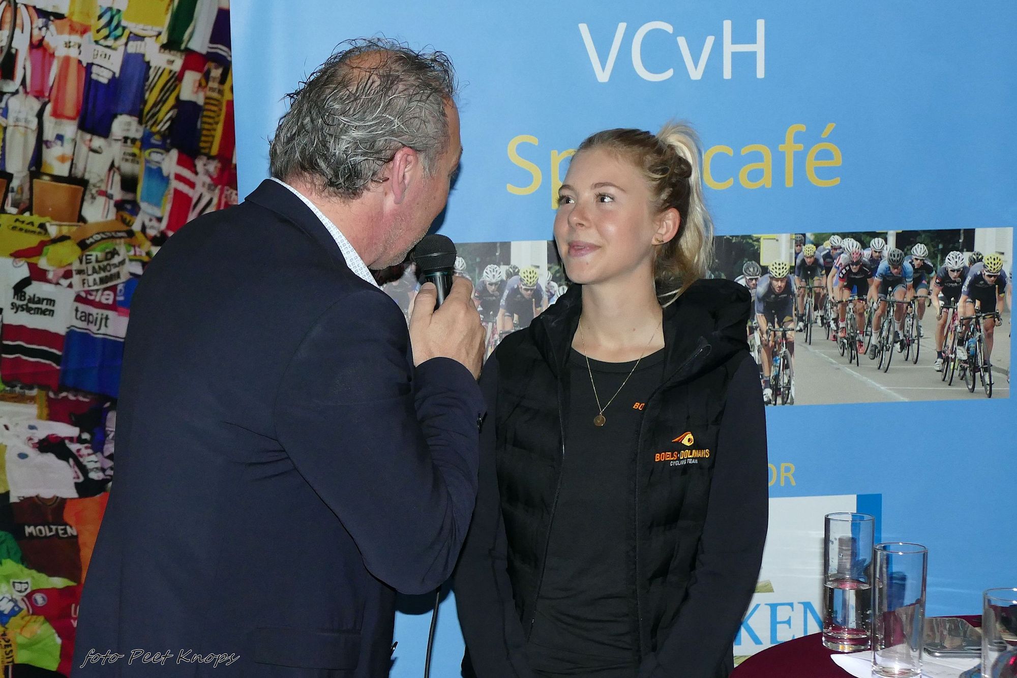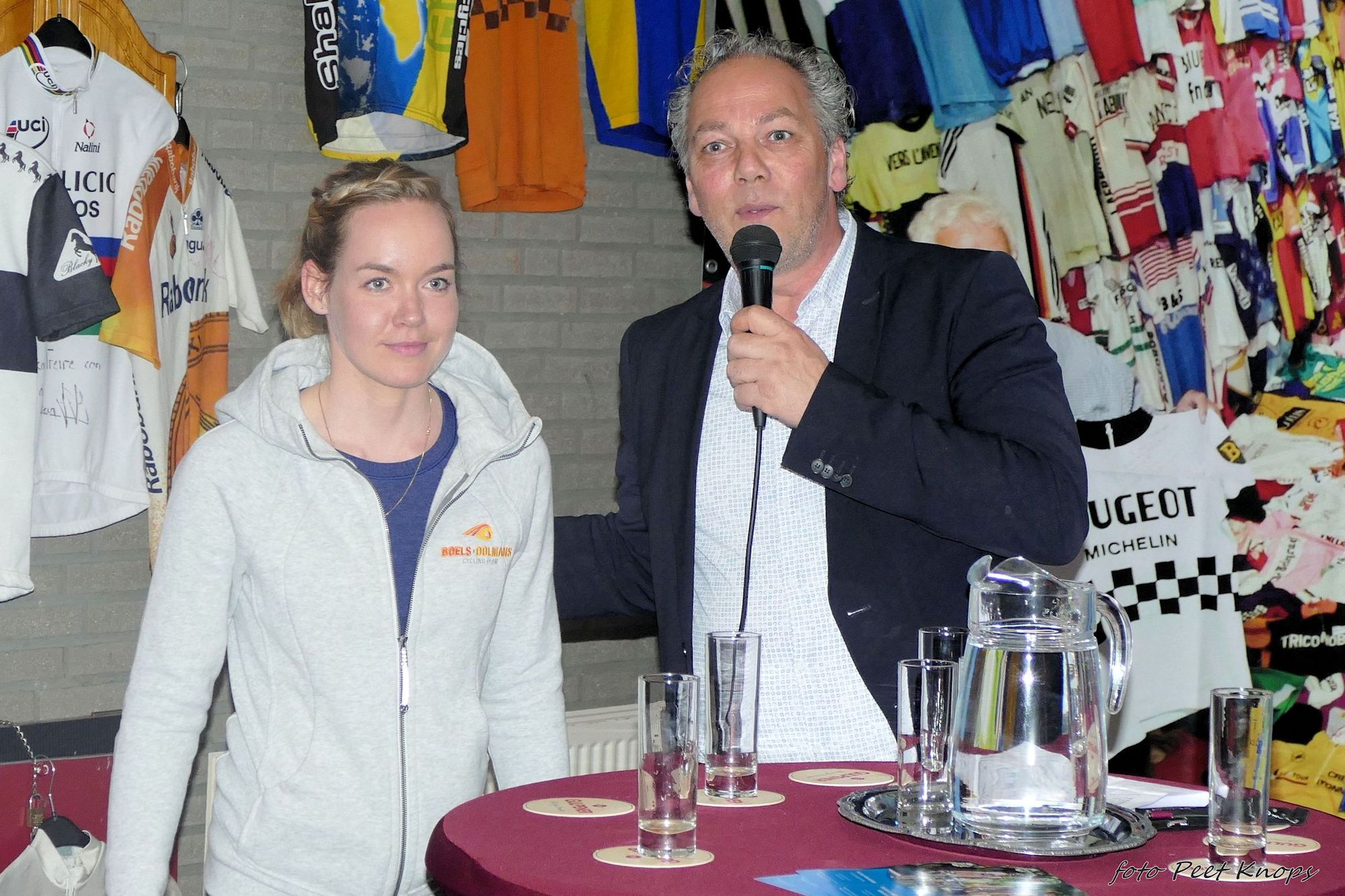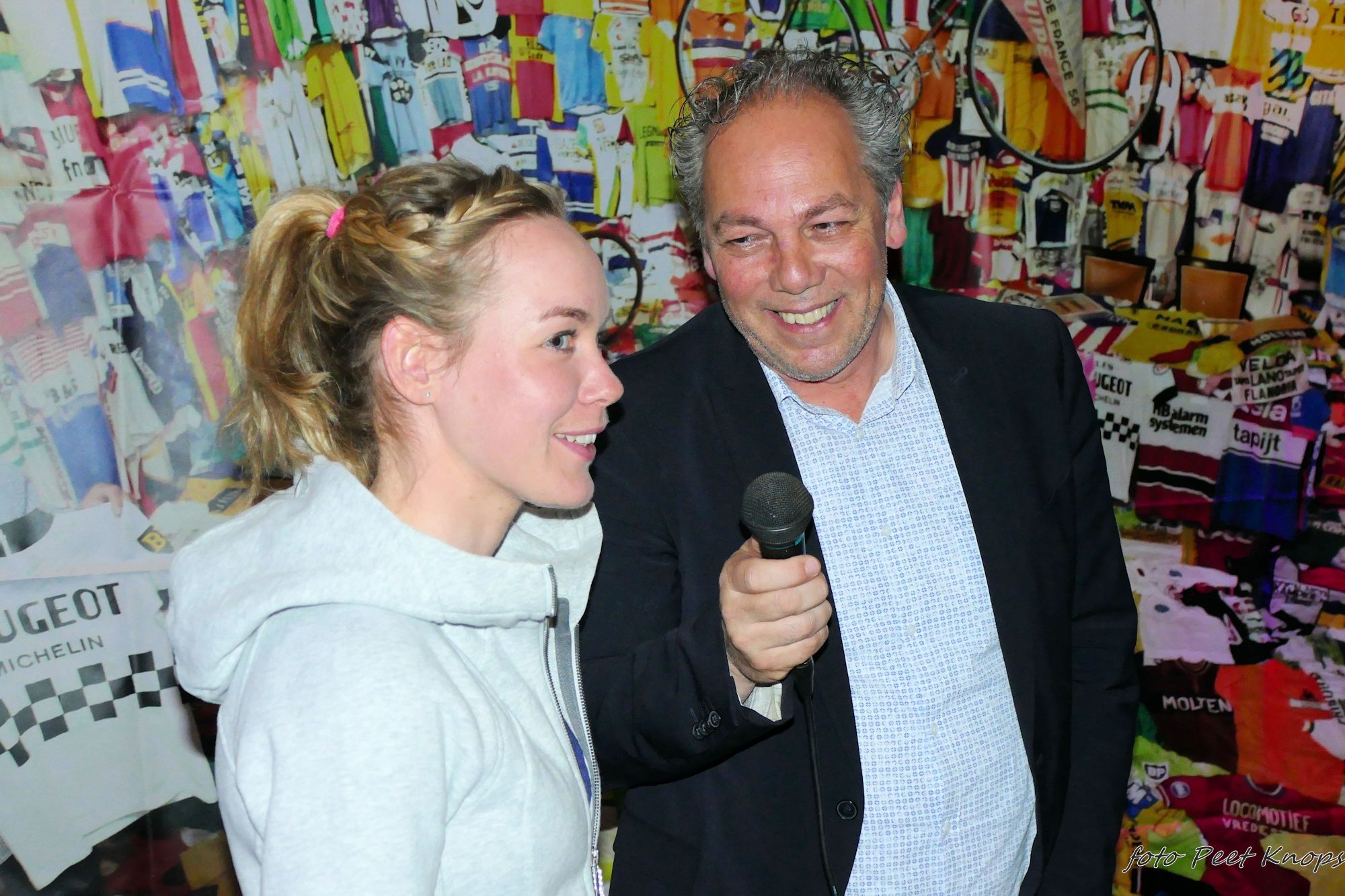 Op het podium Olympisch kampioen Anna van der Breggen, Jip van den Bos, ploegleider Danny Stam en team manager Erwin Janssen. Ze worden door “de Bergklimmers” voorzitter Peter Bouwels aan de tand gevoeld.