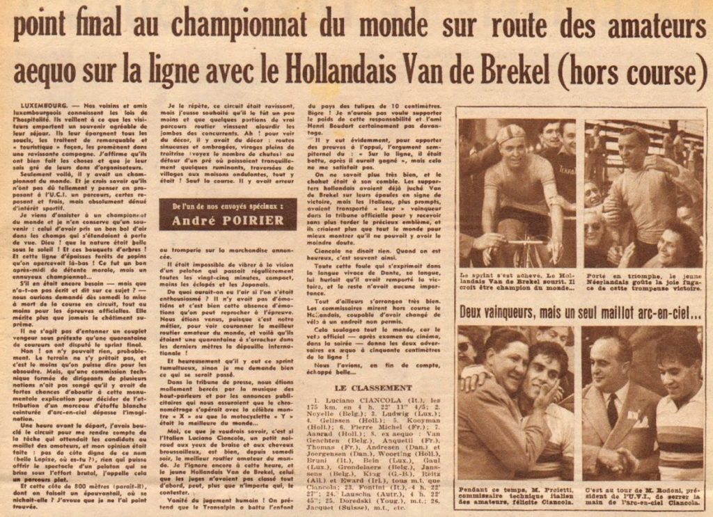 De U.C.I. had dus weer eens een fout gemaakt, iets, wat de Internationale Wieler Federatie de laatste jaren bij elk wereldkampioenschap overkomt. Ciancola was op dat ogenblik geen wereldkampioen der amateurs op de weg. Daartoe is hij voorbarig gebombardeerd door de rechter van aankomst de Fransman Dupin, die beter, wetende dat er een foto-finish was opgenomen, zijn beslissing onder voorbehoud had kunnen geven. En dan zou Ciancola door de heer Achille Toinard niet zo de regenboogtrui zijn aangetrokken dan zou het Italiaanse volkslied niet onmiddellijk zijn gespeeld. De omstandigheid, dat Piet van den Brekel inbreuk had gemaakt op het wedstrijdreglement, was voor de wedstrijdcommissarissen een gelukkig moment, want nu werd Ciancola titelhouder, omdat onze landgenoot van de uitslagenlijst werd geschrapt. Dit laatste geschiedde, laten wij het ronduit schrijven, volkomen terecht.