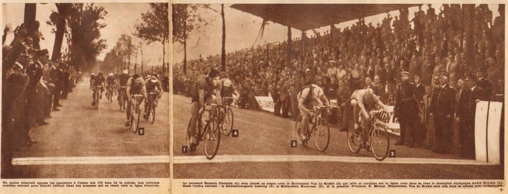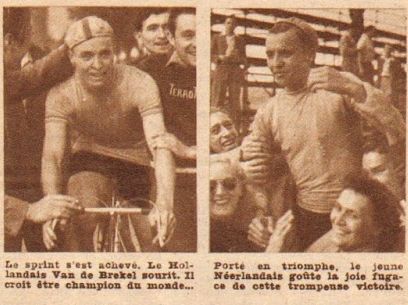 In het Hotel I’Etoile dOr hebben wij Zaterdagavond rustig met Piet van den Brekel, de 20-jarige amateur uit Echt zitten praten. Hij wist, dat hij gediskwalificeerd was, omdat hij een flets van een toeschouwer had genomen. Maar het was hem niet bekend, dat de foto’s en ook de film, welke voor officials en journalisten was vertoond, duidelijk hadden uitgewezen, dat de Italiaan voorbarig tot wereldkampioen was uitgeroepen, want dat nog nimmer een dead heat zo scherp van de foto’s en de film was te lezen als dit keer.