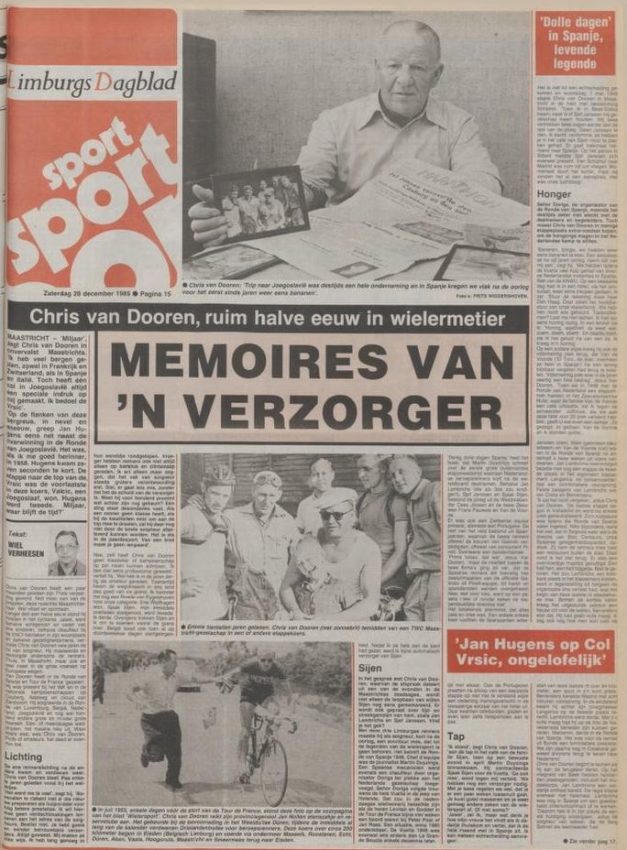 In juli 1946 verscheen het boek “30 dolle dagen Spanje” , het verhaal van de Nederlandse ploeg in de Ronde van Spanje 1946. Mijn stadgenoot, Valkenburger Martin Duyzings, vloog als chef d’équipe met de Nederlandsche wielerploeg naar Spanje en beschrijft in dit boeiende met humor geschreven boek de successen, de tegenslagen en de avonturen van “onze jongens” in de Ronde van Spanje. Het boek kwam voor de somma van fl 2.- van de pers bij de Gazet van Limburg maar de oplage was uiterst beperkt en is heden ten dage nog steeds een gewild verzamelaarsobject. Onderstaand een deel van een interview dat Wiel Verheesen had met Chris van Dooren, die kleurrijk verteld over zijn ervaringen met de equipe als verzorger in de bewuste Vuelta van 1946