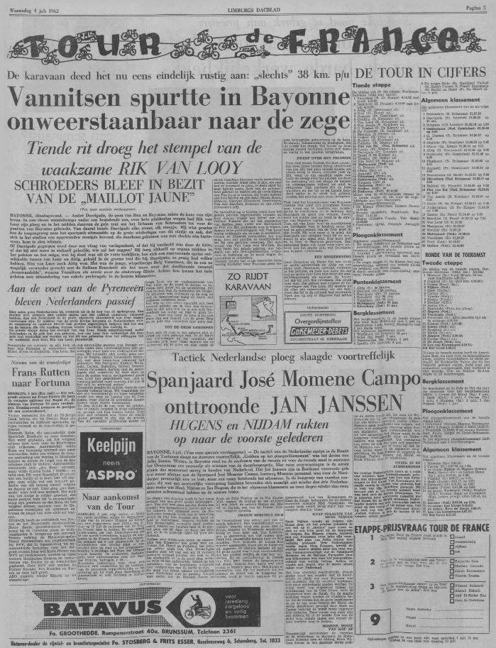De tactiek van de Nederlandse equipe in de Ronde van de Toekomst slaagt tot dusverre voortreffelijk „Gokken op het ploegenklasssement was het devies van Jefke Jansen. Welnu, in Bayonne reed na de aankomst van de tweede rit voor de tweede maal in successie het Oranjeteam een ererondje als winnaar van de dagploegenprijs. Met twee overwinningen is de eerste plaats dus momenteel stevig in handen van Nederland. Dat Jan Janssen zijn in Bordeaux veroverde gele trui moest afstaan aan de Spanjaard José Momene Campo, kortweg Momene genaamd, was voor de Nootdorper persoonlijk niet zo leuk, maar een ramp betekende het allerminst. In de kopgroep van veertien renners, die met een aanzienlijke voorsprong finishten bevonden zich namelijk niet minder dan drie Nederlanders onder wie Henk Nijdam en Jan Hugens, die in het algemeen- klassement na twee dagen minder dan twee minuten achterstand hebben op de nieuwe leider.