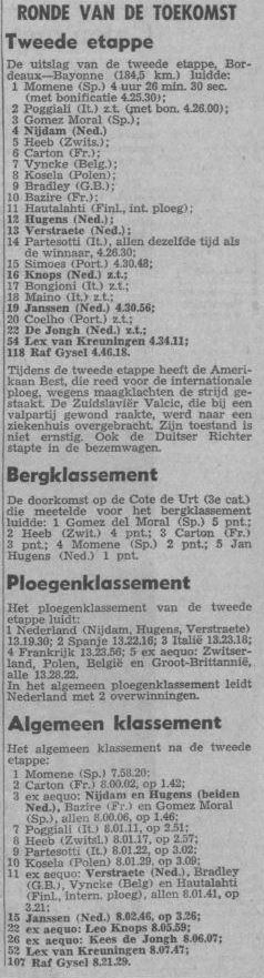 De etappe van dinsdag heeft in het teken gestaan van een groot aantal ontsnappingen. Van rust was geen sprake. Zodra een groepje was teruggehaald, namen een aantal anderen het offensief over. De Nederlandse formatie heeft niet de bedoeling gehad de trui van Janssen met hand en tand te verdedigen. Hugens, Nijdam en Van Kreuningen, eveneens goed geklasseerd, zouden om beurten mee in de aanval gaan als zij daar de kans toe kregen en in de praktijk lukte dit plan uitstekend. Nijdam was waakzaam toen na nauwelijks tien kilometer een groep met o.a. Gomez Del Moral en Petterson het peloton achter zich liet, Van Kreuningen maakte deel uit van een uit 19 renners bestaand leidend peloton, dat zich na 36 km afscheidde en in de grote slag, welke na ruim 60 km ontbrandde, bleken na het optrekken van de kruitdamp welgeteld vier landgenoten van de partij te zijn. De gang van zaken scheen aanvankelijk voor Nederland niet zo gunstig Twaalf man onder wie de Fransen Bazire en Arze, de Belg Vastiau en de Fin Hautelahti, namen de leiding en zes anderen bij wie Jaisli, de actieve Gomez del Moral en Carton, een van de Franse troeven volgden spoedig.