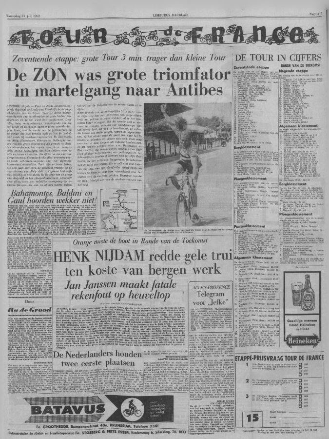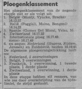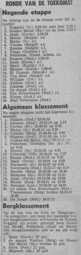 Geen Nederlander in de voorste linies, dinsdag in de negende etappe van de Tour de I’Avenir. De volgers wreven hun ogen uit van verbazing controleerden voor alle zekerheid nog even de opgegeven nummers, maar het was inderdaad waar. In de kopgroep van elf was Oranje niet vertegenwoordigd. Wel bevonden er zich coureurs in als de Italianen Roberto Poggiale en Mario Maino, de Spanjaard Antonio Gomez del Moral, de Zweed Gosta Petterson en de Belgen Camille Vyncke, Ferdinand Bracke en Willy Monty in. Nederland had de boot gemist volkomen verrast door het vroege uur waarop het offensief werd ingezet, Jan Hugens, sedert maandag geen leider meer in het algemeen klassement had opdracht gekregen mee te gaan met de eerste de beste belangrijke aanval. Ook hij had echter niet verwacht, dat de demarrage van de Belg Bracke, nauwelijks twee kilometer na de start in Aix en Provence, de inleiding zou vormen tot de beslissende slag. Hugens kwam evenals zijn ploeggenoten bedrogen uit. Elf man gingen en bleven weg, alle reacties van het peloton ten spijt. Ten koste van zeer veel krachtsinspanningen kon de schade voor de mannen van Jefke Janssen uiteindelijk zodanig worden beperkt, dat Henk Nijdam zijn gele trui behield. Het is echter de vraag of de bergen werk die de oranjemannen op het 201 km lange parcours tussen Provence en Antibes moesten verzetten, niet teveel van de krachten hebben gevergd. Na de alpenrit van woensdag, met obstakels van formaat als de Vars (2111 meter) en de Izoard (2360 meter) zal het pas mogelijk zijn deze vraag te beantwoorden. De winst van de kopgroep waarin mario maino ( vijfde in het algemeen klassement met een achterstand van 5 min 49 sec) de gevaarlijkste man was, werd in ieder geval teruggebracht tot ongeveer 3,5 min, te weinig om Nijdams trui in gevaar te brengen.