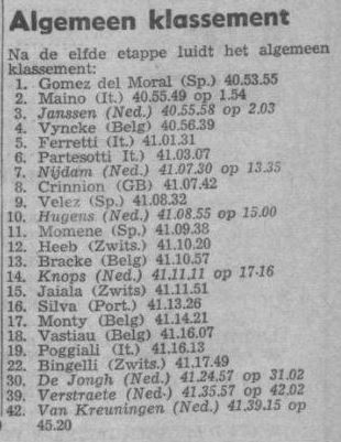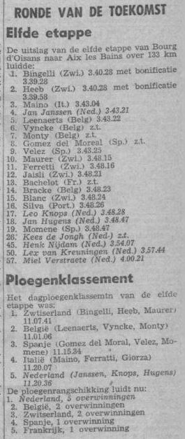 Henk Nijdam ondervond in het begin van de rit de tegenslag van zijn daags tevoren geleverde krachtsinspanningen. Hij “kroop” tegen de col de Porte op. Daarna ging het wel beter, doch zijn verlies in Aix-les-Bains was zodanig dat hij in het algemeen klassement opnieuw enkele minuten verloor en een plaats zakte. Van Lex van Kreuningen en Miel Verstraete tenslotte is bekend dat zij zich in de bergen niet op hun gemak voelen. Vooral de Zeeuw, na aankomst altijd bereid tot een grapje, klimt zeer slecht. Hij heeft zich daarom in de Alpenritten niet in het minst geforceerd, hetgeen met het oog op de eventuele drieste plannen van Jan Janssen alleen maar gunstig genoemd kan worden.