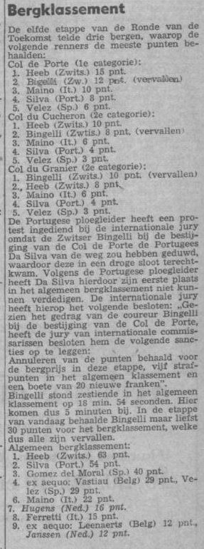 De Portugese ploegleider heeft een protest ingediend bij de internationale jury omdat de Zwitser Bingelli bij de bestijging van de Col de Porte de Portugees Da Silva van de weg zou hebben geduwd, waardoor deze in een droge sloot terechtkwam. Volgens de Portugese ploegleider heeft Da Silva hierdoor zijn eerste plaats in het algemeen bergklassement niet kunnen verdedigen. De internationale jury heeft hierop het volgende besloten: “Gezien het gedrag van de coureur Bingelli bij de bestijging van de Col de Porte, heeft de jury van internationale commissarissen besloten hem de volgende sancties op te leggen:  Annuleren van de punten behaald voor de bergprijs in deze etappe, vijf strafpunten in het algemeen klassement en een boete van 20 nieuwe franken . Bingelli stond zestiende in het algemeen klassement op 18 min. 54 seconden. Hier komen dus 5 minuten bij. In de etappe van vandaag behaalde Bingelli maar liefst 30 punten voor het bergklassement, welke dus alle zijn vervallen.