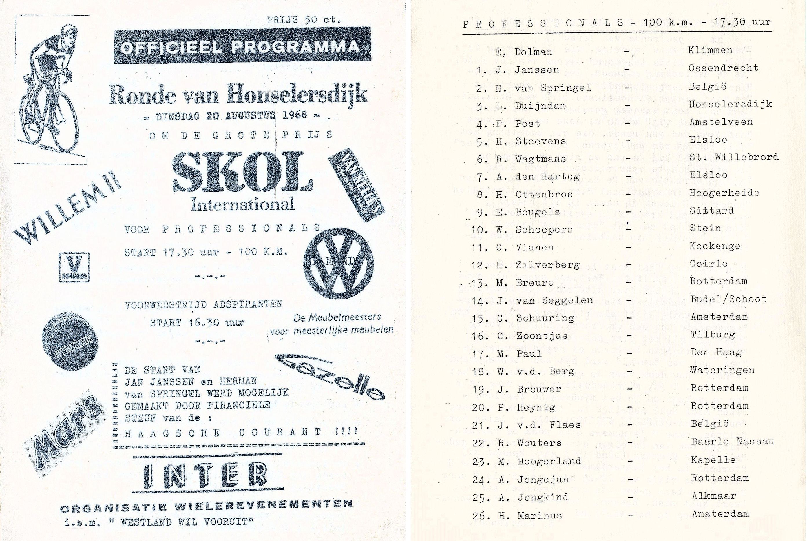 Francien: George en Dirk waren twee handen op een buik in hun liefde voor het wielrennen. Het was op een zaterdagavond, juli 1968, dat de telefoon ging en George het idee opperde. Dirk was er meteen voor te vinden. En hoe ze het voor elkaar kregen weet ik niet meer, maar al drie weken later ging de eerste Honselersdijkse profronde van start! En het was niet zomaar wat: Jan Janssen, de eerste Nederlandse tourwinnaar, startte. Dat kon niet anders als een groot succes worden en dat werd het ook. Het was verschrikkelijk druk in het dorp en de kranten stonden er van vol.’