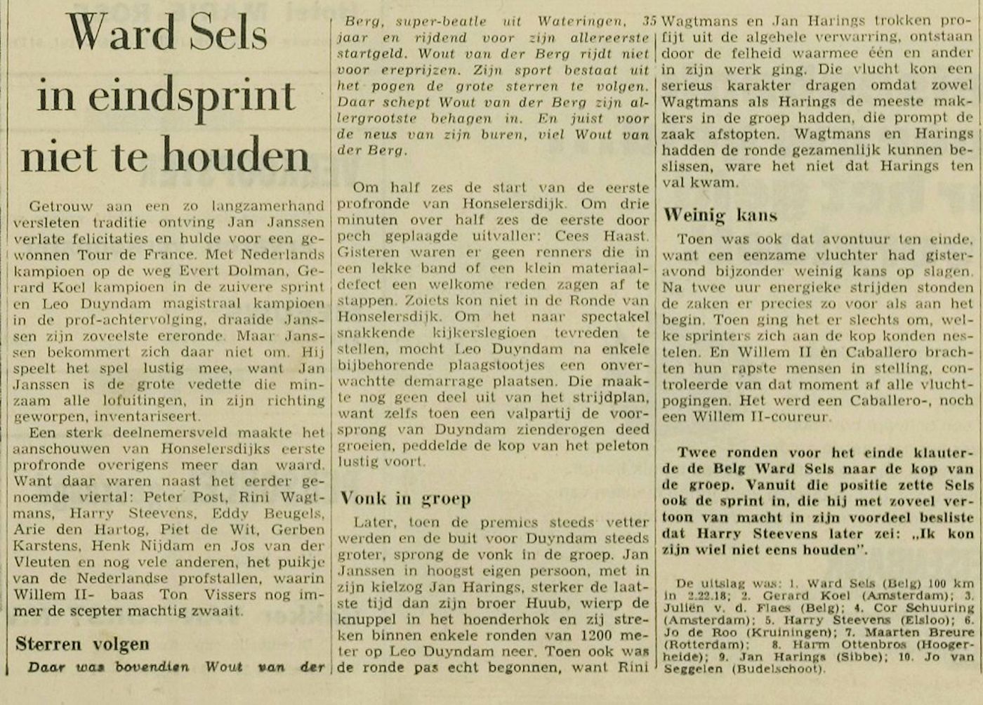 Vooraf in De Haagsche Courant: “Eerzame huismoeders slingerden met de grootst mogelijke stemverheffing aanmoedigingen naar Leo Duyndam tijdens zijn vertwijfelde vlucht. Na de finale de teleurstelling. Geen bloemen voor Leo Duyndam, zelfs geen plaats bij de eerste twintig voor de naar de overwinning toegesmeekte coureur. Maar het Westlands wielerpubliek is sportief. Winnaar Ward Sels kreeg een daverend applaus.