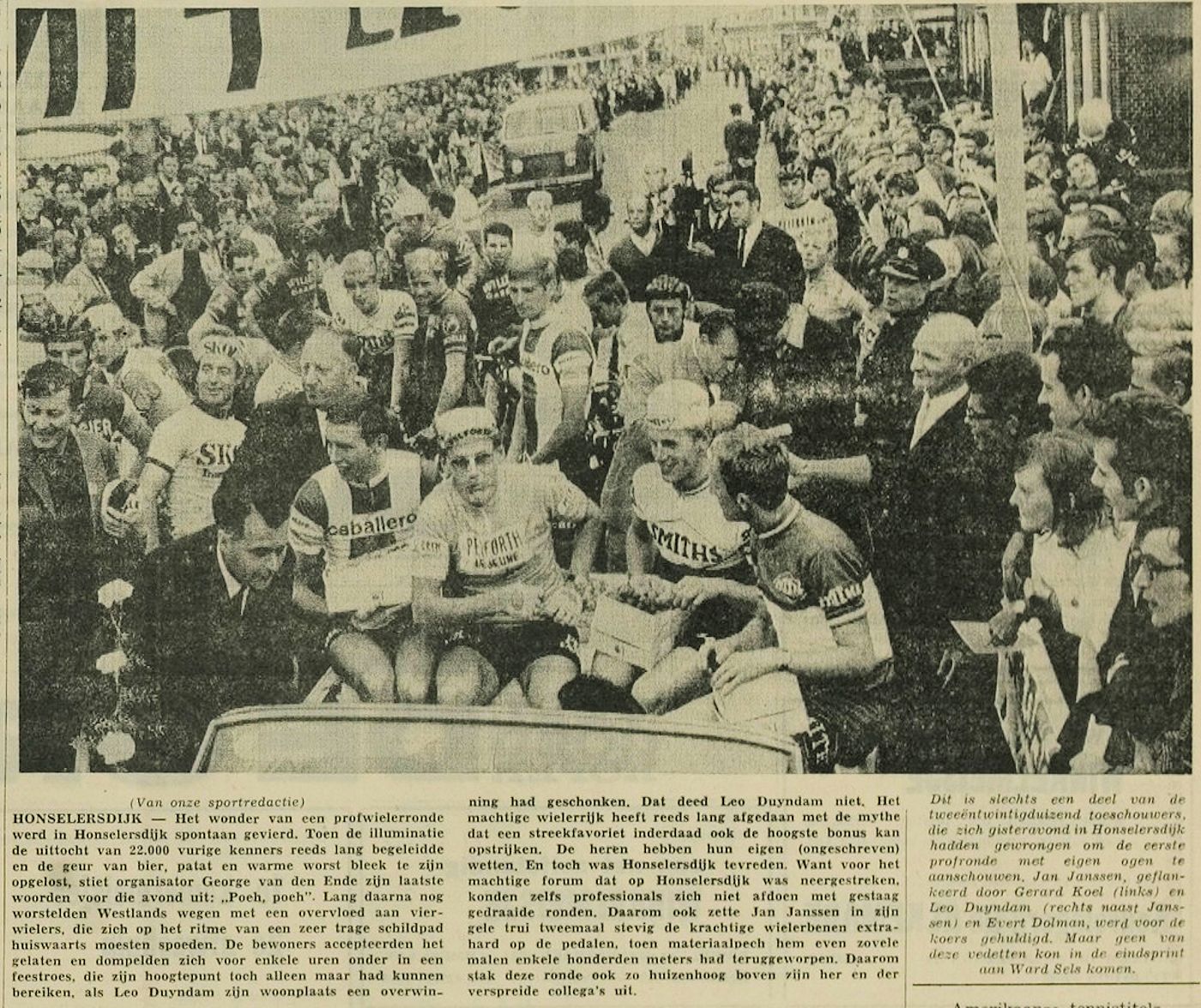 Het was het vuurwerk aan het slot van een volmaakt volksfeest. Honselersdijk, heel het Westland was uitgelopen om de vedetten te bejubelen.’ Ze waren er allemaal: Jan Janssen, stralend in het geel, zijn vazallen uit de Tour, Eddie Beugels, Arie den Hartog en wegkampioen Eef Dolman, „zesdagenkeizer” Peter Post, sprintkampioen Gerard Koel, Rinie Wagtmans, Harrie Steevens, Harm Ottenbros, allemaal…