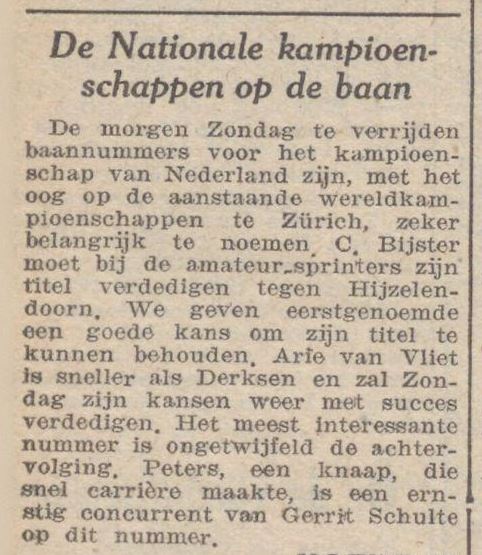 De morgen Zondag te verrijden baannummers voor het kampioenschap van Nederland zijn, met het oog op de aanstaande wereldkampioenschappen te Zürich, zeker belangrijk te noemen. C. Bijster moet bij de amateur-sprinters zijn titel verdedigen tegen Hijzelendoorn. We geven eerstgenoemde een goede kans om zijn titel te kunnen behouden. Arie van Vliet is sneller als Derksen en zal Zondag zijn kansen weer met succes verdedigen.
