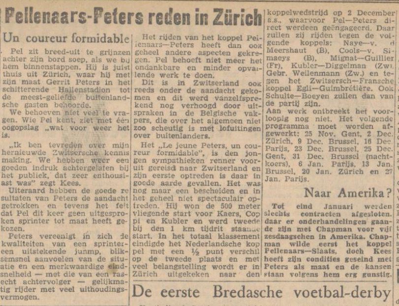 Het „Le jeune Peters, un coureur formidable”, is den jongen sympathieke renner vooruit gereisd! Naar Zwitserland en zijn eerste optreden is daar in goede aarde gevallen. Het was nog maar een bescheiden en in het geheel niet spectaculair optreden. Hij won de 500 meter vliegende start voor Kaers, Coppi en Kubler en werd tweede bij den 1 km tijdrit staande start. In het totaal klassement eindigde het Nederlandse koppel met een half punt verschil op de tweede plaats en met veel belangstelling wordt er in Zürich uitgekeken naar de koppelwedstrijd op 2 december a.s., waarvoor Pellenaars-Peters direct werden geëngageerd.