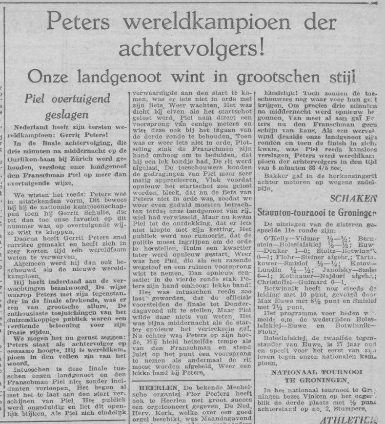 We wisten het reeds: Peters was in uitstekende vorm. Dit bewees hij bij de nationale kampioenschappen toen hij Gerrit Schulte, die tot dan toe onze favoriet op dit nummer was, op overtuigende wijze wist te kloppen. Daarna heeft Gerrit Peters snel carrière gemaakt en heeft zich in zeer korten tijd een wereldfaam weten te verwerven. Algemeen werd hij dan ook beschouwd als de nieuwe wereldkampioen. Hij heeft inderdaad aan de verwachtingen beantwoord. De wijze waarop Peters met zijn tegenstander in de finale afrekende, was er een van grootse allure. De enthousiaste toejuichingen van het duizendkoppige publiek waren een verdiende beloning voor zijn fraaie rijden. We mogen het nu gerust zeggen: Peters staat als achtervolger op eenzame hoogte. Hij is wereldkampioen in den volle zin van het woord. Intussen is deze finale tussen onzen landgenoot en den Fransman Piel niet zonder incidenten verlopen. Het begon al met het te laat aan den start verschijnen van Piel Het publiek werd ongeduldig en liet dit openlijk blijken. Als Piel zich eindelijk verwaardigde aan den start te komen, was er iets niet in orde met zijn fiets. Weer wachten. Het was dicht bij elven als het startschot gelost werd. Piel nam direct een voorsprong van enige meters en wist deze ook bij het ingaan van de derde ronde te behouden. Toen was er weer iets niet in orde. Plotseling stak de Fransman zijn hand omhoog om te beduiden, dat hij een lek bandje had. De rit werd afgelast. De toeschouwers konden de gedragingen van Piel maar zeer matig appreciëren. Vlak voordat opnieuw het startschot zou gelost worden, bleek, dat nu de fiets van Peters niet in orde was, zodat we weer even geduld moesten betrachten totdat onze landgenoot van rijwiel had verwisseld. Maar nu kwam Piel tot de ontdekking, dat er iets niet klopte met zijn ketting. Het publiek werd zo rumoerig, dat de politie moest Ingrijpen om de orde te herstellen. Ruim een kwartier later werd opnieuw gestart. Weer was het Piel, die als een razende wegstoof en een ruimen voorsprong wist te nemen. Dan opnieuw sensatie: in de vierde ronde stak Peters zijn hand omhoog: lekke band!
