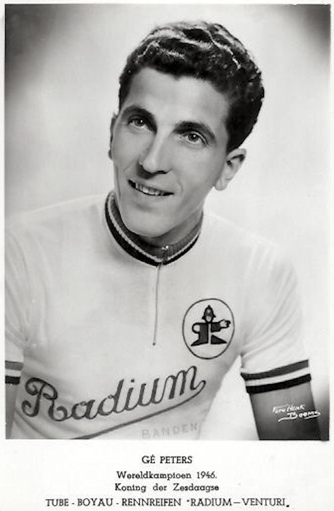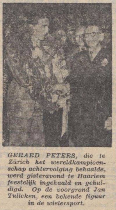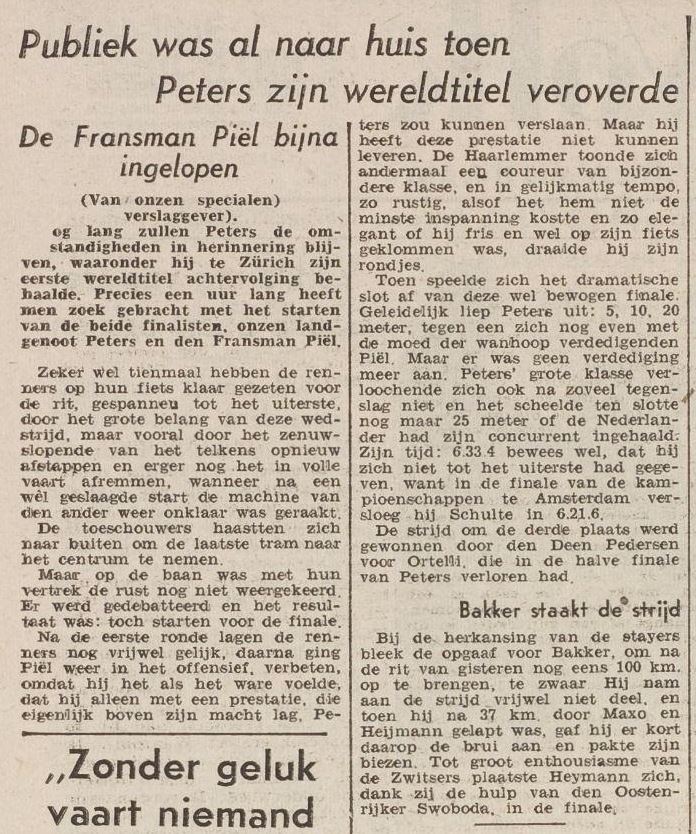 We hebben hem Zaterdagmiddag op de Oerlikonbaan zijn serie zien rijden tegen den Belgische kampioen René Adriaensens en de wijze waarop hij die rit won stempelde hem tot den wereldkampioen in spé. In een uitermate soepele stijl draaide hij in die rit naar de overwinning en hij lag veruit in gewonnen positie toen zijn achterband leegliep. Zo was ook de Italiaan Vito Ortelli in de halve finale gekomen toen zijn Zwitserse tegenstander Hugo Koblet in de tweede helft van de rit een lekke band kreeg. De nieuwe ster aan de wielerhemel Roger Piel, een jonge Fransman, die kort geleden het Franse kampioenschap onverwacht won van Blanchet had zich voor de halve finale geplaatst door den Luxemburger Marcel Poiré geheel in te lopen. De Deen Petersen had zich door een walk over in de halve finale geplaatst. Nu zult ge beweren : ja maar, hoe kunt ge nu beweren dat Gerard Peters kampioen zal worden. Welnu, dat zal ik u zeggen! Omdat zowel de Italiaan Ortelli als Roger Piel hoewel van zeer grote klasse, mij niet het zuivere type van den achtervolger lijken Ortelli zat op zijn zadel te schuiven en dat, toen de rit nauwelijks halverwege was en Roger Piel’s rit -was een copy van de rit van den Italiaan. Zn’ reden op winst in de eerste helft wetend, dat zij in de laatste kilometers in moeilijkheden kwamen. Welnu en ze reden zo hard dat zfl weliswaar tegen Peters een kleine voorsprong zeiden kunnen bewerkstelligen als zij tegen hem in de halve finale zouden komen, maar die zou niet groot genoeg zijn om iets tegen Peters in de laatste kilometers uit te richten. Ja de Deen Petersen zou voor een verrassing kunnen zorgen, doch naar de tijden die hij te Kopenhagen maakte te oordelen lijkt hij me wel een aardig temporenner doch geen man van de extra-klasse. Ik voorzie dan ook een finale Gerard Peters – Roger Piel op Dinsdagavond En onze landgenoot als wereldkampioen!